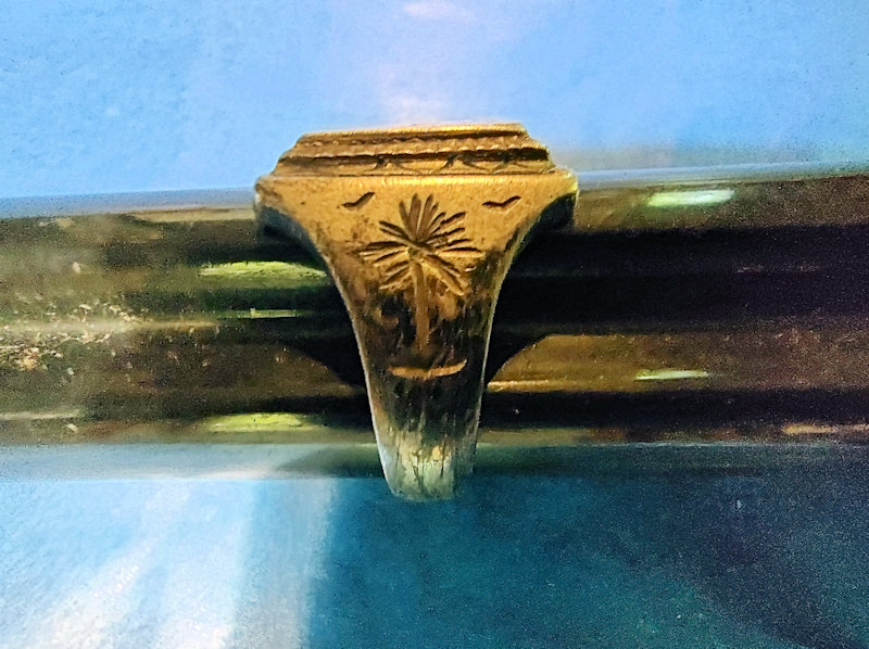 | DESCRIPTION: Here is a rather worn, but most discernible, Afrika Korps ring, size 9. It has the palm trees on front and sides. It is very crudely done because many of these rings were often created by local craftsmen. The soldier who just wanted a remembrance of his service had these done and as there are many great ones, there are as many not-so-great ones probably because of the wearer’s available funds.