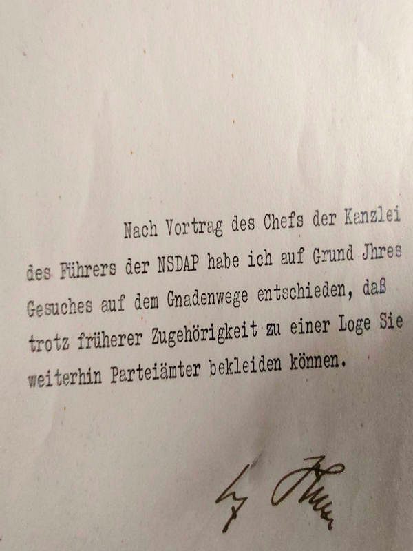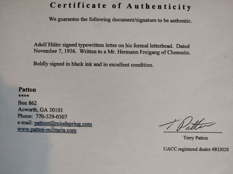 DESCRIPTION: This is a very special presentation of Hitler’s signature on his personal stationary. The black ink is bold and the Hitler signature is crisp and clear. The document is in excellent condition. It is a brief letter stating the following: After presentation by the head of the office to the leader of the NSDAP, I decided based on your request that you could continue to be a Party member despite your previous membership in a lodge. The Party did not always like previous organizations’ new members may have belonged to and this is Hitler’s approval of a man seeking membership. The document was obtained from Terry Patton, UACC registered dealer, his COA shown here. Patton Militaria is well-known for their autographs; authenticity is not debated on this item. PRICE: SOLD |