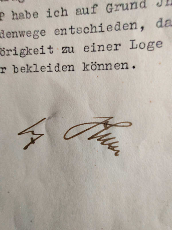 Above is a chart illustrating some of the signatures of Adolf Hitler. It shows how they changed a bit over several years’ time. The boldest and most powerful is seen at July 1940; however, we direct your attention to the signatures identified at March 5, 1933, and, especially, December 1934. You will note that the name Hitler descends more rapidly than on the other examples in some of the later years. Hitler’s basic style and special configuration never changed much after 1923, but since no two signatures are alike especially when writing to a close friend or party colleague as you see in the letter above to someone as close as H. Himmler, then he was likely to scribble a little. However, when signing an official document, he was infinitely more circumspect. It’s only natural that his various moods might have an effect on his writings and signatures. It should also be kept in mind that he might at one time be writing in pen or, instead, in pencil; it usually will make a very noticeable difference. The book from which this assemblage of Hitler signatures is derived is Leaders & Personalities of the 3rd Reich: Their Biographies, Portraits, and Autographs, Volume 1 by Charles Hamilton. The late Mr. Hamilton was the world’s foremost authority on signatures of famous personalities. It’s unfortunate that my friend, Mr. Hamilton, never got to see this historically important document before his passing because he, above all others, would have sincerely appreciated it. |