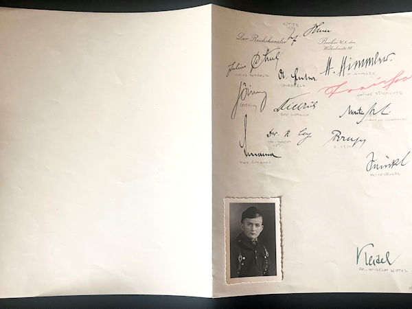 DESCRIPTION: We are very proud to offer this unique set of signatures that was collected by a Hitler Youth boy during his visit to the Reich Chancellery. The signatures of these 20 high-level National Socialist dignitaries appear on the personal Reich Chancellery stationary of Adolf Hitler. The young man was probably related to someone who was able to introduce him to these leaders of the Reich. Many of the signatures were obtained at an event at the Chancellery in 1935, while some were obtained afterwards. The Hitler Youth boy was proud enough that he had them framed with his photograph to recount those special times of meeting these unique leaders of the Third Reich. The signatures are as follows: