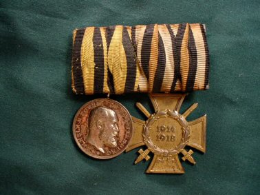 | DESCRIPTION: This is a group of two WWI medals comprised of the silver Service Medal of Wilhelm II of the Land-Wurttemberg and the General Service Medal for German combat forces in WWI. Condition of medals is good; ribbons tarnished.