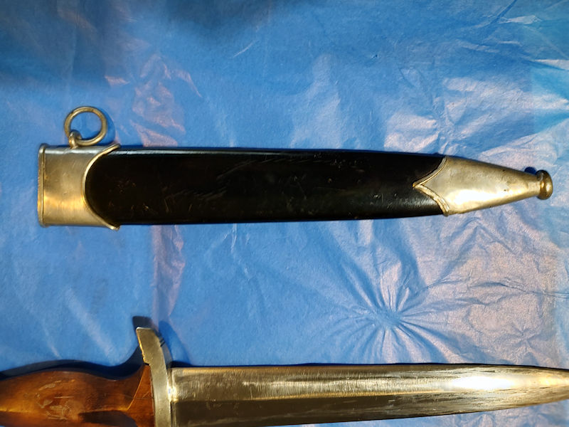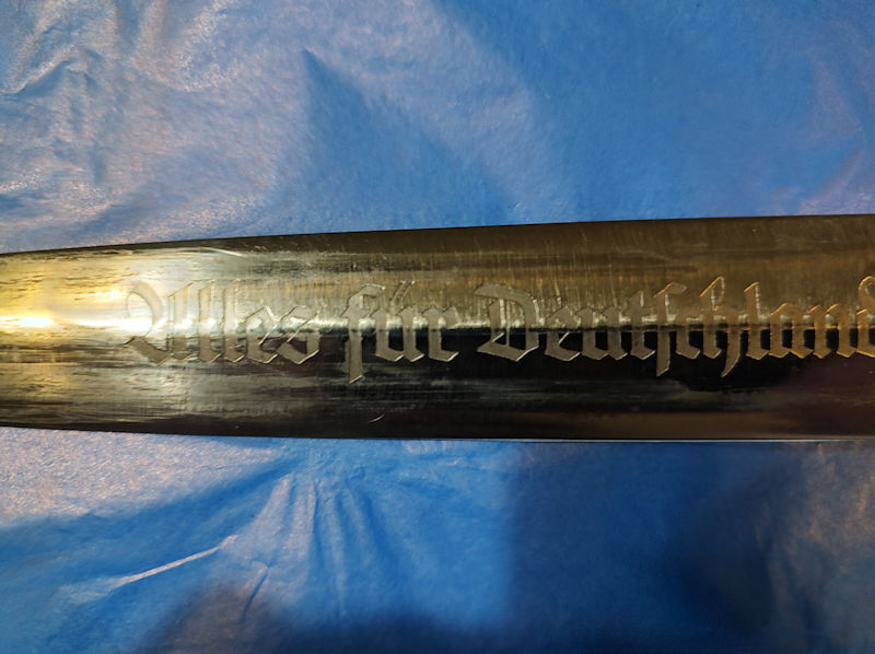 DESCRIPTION: Here is a very pristine dagger with “E. P. & S.” for “Ernst Pack & Söhne” Solingen as the maker. It has the nickel fittings and black-painted scabbard. “Alles für Deutschland” is most prominent and clean on the blade. There is the normal slight wear on blade from being removed from scabbard; slight wearing as to be normal on scabbard. All in all, this is a great price for a very handsome dagger.