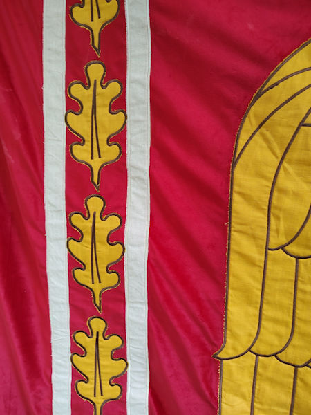 DESCRIPTION: These flags are most remarkable for several reasons. Years ago, a distributor approached a noted manufacturer of high-end embroidery and wanted to emulate as close as possible the flags of the Third Reich. He accomplished his task. This remarkable flag is constructed with nearly the same threads, silk, and file weave, hand embroidered, which is why they are hard to keep in stock; the manufacturer has told me that there is usually a 5-7-week wait. The Third Reich 1939 Flaggenbuch shows the flag, being the first one of Hitler’s personal standards, so, indeed, this is a remarkable re-creation that turns the heads of the collectors. The gold bullion makes the eagles precise and highly detailed, appearing 3-dimensional as do the oak leaves surrounding the swastika. This is work that’s hard to obtain today. It's perfect for display against a wall or free hanging as it's double sided with a place at the top to slip a rod through. These flags are not flimsily made, but with tight sewing. The manufacture makes many flags and uniforms from all militaria genre for museums and collectors alike. These flags are so well done that unfortunately they are sold as real by unscrupulous dealers or people just believing they are real. I am speaking from experience when approached by them; however, when I tell them they are new they usually don’t believe me because the workmanship is so well executed; they don’t believe it's contemporary, but done in the Third Reich where perfection in flags and uniforms was a demand. It’s a bold 24 x 24 inches that will look impressive wherever you place it for your historical statement.