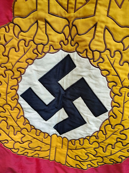 DESCRIPTION: Here is an exceptional museum quality re-creation of a banner of the type used by speakers from the National Socialist League of the Reich for Physical Exercise (NSRL). This insignia was the official distinguishing badge of this important sports organization within the NSDAP. Here you see it embroidered and emblazoned upon a banner 30 inches long and 24 inches wide with the organization's exclusive eagle pattern in its center and the name "Berlin" at the top. This NSRL had a major role in the structure and coordination of the Summer Olympics in 1936, along with the Reichssportsführer Hans von Tschammer und Osten. The banner is in very excellent condition throughout. It has nine suspension loops at the top, and has silver fringe on all sides except the top. The silver oak leaves surrounding the eagle are in a word "beautiful." The embroidery work on the eagle is exemplary, as well.