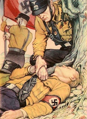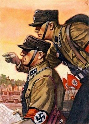 DESCRIPTION: We proudly present an exquisite reduplication of Wolfgang Willrich’s folder of 12 prints produced in 1936 featuring the bust portraits of both Allgemeine and V.T. Troopers. Although Willrich was one of the most gifted and prolific artists of the Third Reich, this particular offering is so rare that only 3 original sets are known of in collections today. Therefore, we are extremely pleased to offer this magnificent reproduction that is accurate in every detail including size, sepia tones, and the finest printing quality available anywhere. We have a limited quantity available and because of the beauty and rarity of this portfolio, we are sure that it will become valuable in a short time; a real collector’s opportunity. The prints are individually presented and not bound (suitable for framing) and measure 11 1/2 x 16 1/2 inches with a page of the same dimensions containing a foreword by Heinrich Himmler concerning the importance of this set of prints to the ideology of the Nazi Movement. All are enclosed inside a heavy and handsome black folder boldly embossed with the SS runes and legend. PRICE: $39.95 plus postage and handling -dealer inquiries solicited - very good lot prices available |