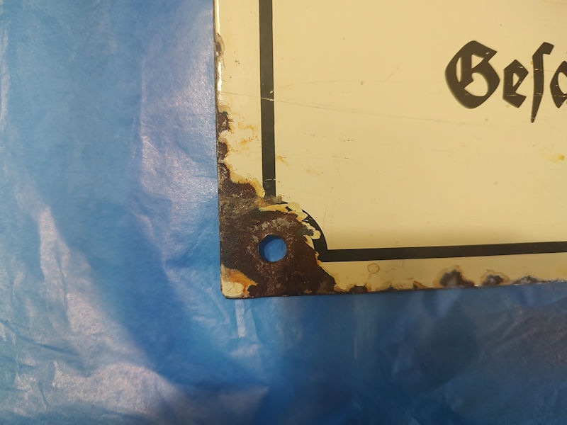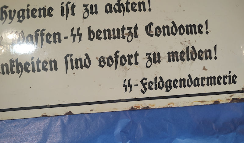 DESCRIPTION: The German army was very keen in keeping venereal disease at a bare minimum and nowhere was that more stringent than in the SS. Even a minor sexual discretion could get you booted out immediately. Here we have a VERY RARE and authentic sign that was posted in a brothel telling the SS men to use condoms and report those who are suspected of having disease. The courtesans are instructed to hand out the condoms and failure to do so gets them reported. This edict is signed by the SS Field Gendarmerie. The sign is the oval type of the times, enameled steel, and is absolutely authentic. Holes for mounting are there with minor rust. This is extraordinarily rare!