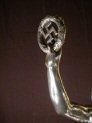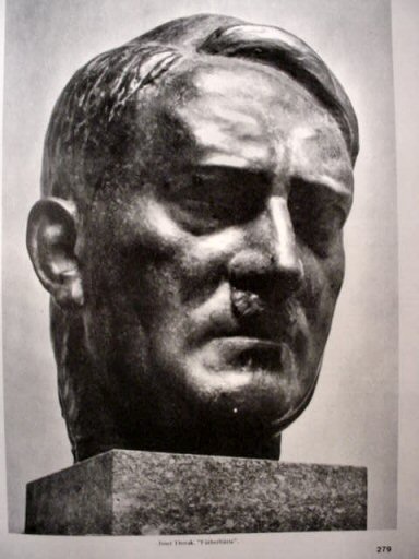 | DESCRIPTION: Germania International, LLC now enjoys the reputation of being unique because the articles of history offered here lead and vastly surpass all competitors’. We constantly strive to bring you, the connoisseur, the finest and, ultimately, the most rare and important of Third Reich objects. He we present what is without a doubt one of the greatest pieces of Nazi art ever offered on the web. This is a magnificent unique statue by one of the two most prolific and superb artists in N.S. Germany, namely Arno Brecker and Josef Thorak, both sculpting heroic-proportion Germanic subjects. These were the official state artists, reaching this coveted title through their supreme skill in sculpting the human figure in the form which God created them in. Thorak depicted men and women as nature and divinity intended. No one since Michelangelo ever came close to their work. It was truly heavenly inspired, indeed! This elegant example of Thorak's work is cast in pure 800 silver--not plated--but solid silver. Why silver and not bronze? Because it was actually an official state presentation to Germany's chancellor, Adolf Hitler. On the base one can perceive the words engraved there: "Nürnberg - Reichs - Parteitag 1937." This pilot piece was actually presented to Hitler himself by Josef Thorak in commemoration of the future unveiling of the same figure in gigantic proportion at the grounds of the party rallies. In several books on the art of the Third Reich, this very same silver statue is shown. Note the picture we have provided directly from the official German book, Reichstagung in Nürnberg 1937, Der Parteitag der Arbiet, Reich's Meeting in Nuremberg 1937, The Party Day of Work showing the actual silver figure we offer here (THE VERY ONE!). The words underneath the picture translate to: "'Victory of Labor' by Professor Thorak, an honorary gift to the Führer from the artist." This is without a doubt at least one of the most famous creations by one of the most renowned artists of immense majestic statuary. Thorak's work transcends the Nazi era and there have been many articles in books and magazines about this man and his immortal creations. The importance of this wonderful objet d'art cannot be overemphasized, not only because of the great fame of the artist or the prestige of to whom it was presented, but for the sheer beauty of the piece itself. Whether the later figure in huge proportion was shown in bronze or stone is unknown to us at this time. The sculpture was said to have been modeled from a picture of German Olympic gold-medal winner Tillie Fleischer, who was a favorite of Adolf Hitler. The figure was, we believe, meant to have been the largest central theme within the confines of the planned, but never completed, Sportspalast on the rally grounds. The figure also became the forerunner of the popular theme, which dominated the Third Reich art form. In the accompanying pictures of Thorak statuary one can readily see the Kunstgeist, or motif, valiantly expressed. The artist on behalf of the Ministry of Labor presented the nude figure personally. This must have been the absolute highlight of the artistic career of this extremely fine artist, born in 1889, the same year as the Führer, and not geographically far apart--Thorak in Vienna, Hitler a few miles away in Brannau. A sketch of this illustrious career and a history of his works will accompany the statue. As long as man aspires to artistic fineness and admires the human body in its finest portrayal, Josef Thorak's works will be remembered. Here is the chance to acquire the "best of the best" and to preserve it for posterity. At the end of the war many of Thorak's works were destroyed by the Kulturträger, "Bringers of Culture:" the equestrian statue of Frederick the Great, the model for the "monument to work," and the groups for the Nuremberg Marsfeld, so, in all probability "Sieg der Arbeit" in its final form was one of them. The Bekronung, group, discovered in his studio in Berlin was used by American soldiers for target practice. This figure has the artist's signature on the reverse of the base: 'THORAK.' The '800' silver mark appears with the moon and crown acceptance mark on the side of this base. The figure weighs about 45 pounds and is about 34 ½ inches high. The measurement of the black marble base is 10 by 7 ¾ by 1 ¾ inches. After the auspicious occasion of its presentation, the figure was taken to the Führerbau or "leader's building" in Munich. In this beautiful building in what was known as the Haupstadt der Bewegung or "Head City of the Movement," it stayed until looted by GI's. This building still stands today in the Königsplatz and is virtually unchanged except that the once-proud eagles and swastikas that surmounted the twin entrances are gone. This is without doubt one of the most famous creations by one of this world's most renowned artists. Although smaller than his other immense statuary it was important enough to present to the world's most powerful head of state. Nothing as important as this was ever offered on the web or ever in all probability ever will be, again. "Here it is in all its glory!" Be sure to look at the pictures from the Reichsparteitag book. Very seldom does a Hitler item of such artistic and historic importance ever show up. This is practically the ultimate for all reasons promulgated.
