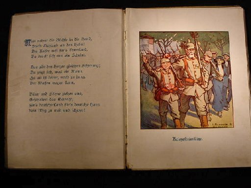| DESCRIPTION: Father is in the War is a special little children’s book published in Berlin and sold back in 1915 for 1,20 Deutschmarks; 25 pfennig going to the collection for the war effort and wounded-soldiers’ fund. The book was published for this purpose and sponsored under the auspices of the Crown Prince palace. It’s hard covered, but shows much wear on the covers and has some loose pages, but they look to be all there from the first page that has a picture of Santa Claus. We can only assume it was a Christmas book meant to support patriotism in the war years. The pictures are all drawing of German soldiers, sailors, airmen, machines, and ships in action. The drawings are typical of children’s-book illustrations: simple but charming with brilliant color. The first picture is that of the German crown prince upon his white steed. This is the only torn page, but has been mended with tape. The book measures 7 1/4 x 9 3/4 inches. The pictures are mostly 5 1/4 x 5 5/8 inches. It’s old, used. Loose, “but” charming and rare.