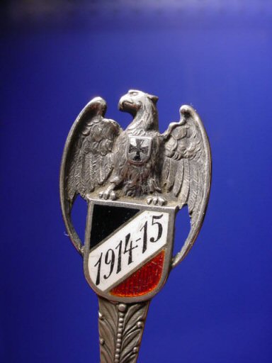 | DESCRIPTION: This is an art spoon from the first year of the Great War, 1914-1918. It has the wonderful German eagle perched on a shield with the German national colors—black, white, red—with the years 1914-15 emblazoned upon it. I’m sure there were no 1916-1918 spoons made since the sheer horror of the war overshadowed the artistic aspects completely by then. This eagle was used on pendants that we often encounter as well. It came to be known as the patriot eagle. It has the Iron Cross in the center of its chest (very classic looking). The spoon measures about 5 1/2 inches and is crafted in genuine ‘800’ silver and is so marked along with logo stampings from the company. The style is art deco personified “Jungstahl.” This is one of finest of the art spoon collection that we recently purchased in Germany. These spoons were rare collector’s items in their day and it was usually the more wealthy burgers who invested in them. The artwork is incredible and this particular one is a very fine example in its design. This is a very good investment piece.