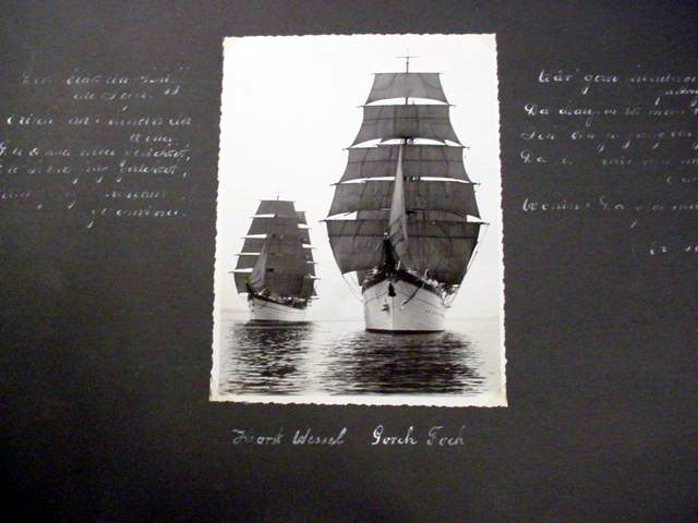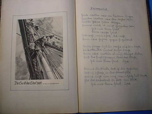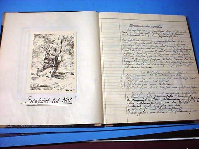 DESCRIPTION: Here is a great hand-lettered and pictured logbook from a sailor who was assigned on the three-masted barque that was the first of a series built as school ships for the German Navy in 1933. This was the glorious Gorch Fock named for the German writer Johann Kinau, who wrote under the pseudonym ‘Gorch Fock.’ Kinau had died in the 1916 Battle of Jutland aboard the cruiser SMS Wiesbaden. Gorch Fock served as a training vessel for the German Reichsmarine prior to WWII. During the war, she was a stationary office ship in Stralsund until she was officially reactivated on April 19, 1944. On May 1, 1945, the crew scuttled her in shallow waters off Rügen in an attempt to avoid her capture by the Soviets, who had already fired at her for 45 minutes with tanks. She was then raised and salvaged and unfortunately she was now in the hands of the Reds and renamed Tovarishch (Comrade)—a terrible end to a proud German ship that now unfortunately was in homeport in Odessa. After the dissolution of the horrid Red dream in 1991, Tovarishch sailed under the Ukrainian flag and after several more transfers—including to England—she was transported to Wilhelmshaven, Germany, and then after some repairs she was finally returned to Stralsund in 2003. On November 29, 2003, the ship was rechristened Gorch Fock and is now a museum attraction there. On August 23, 1958, a modern Gorch Fock was launched in her honor and sails today again as a training ship for the German Navy.