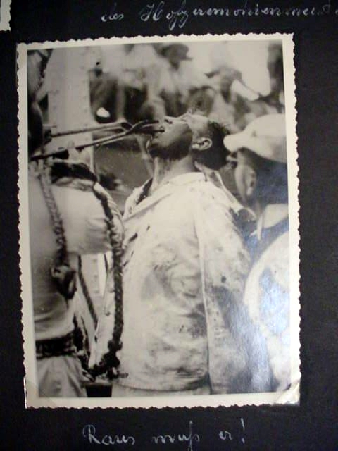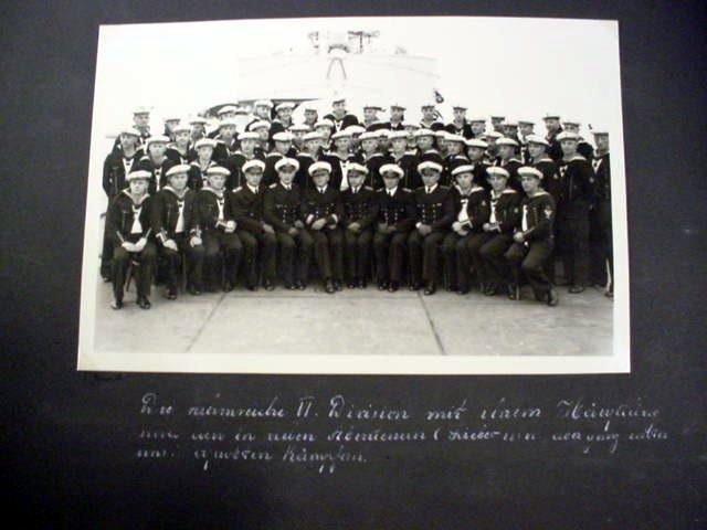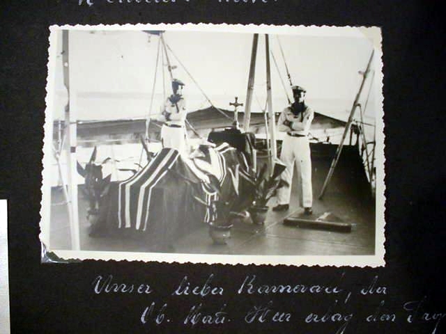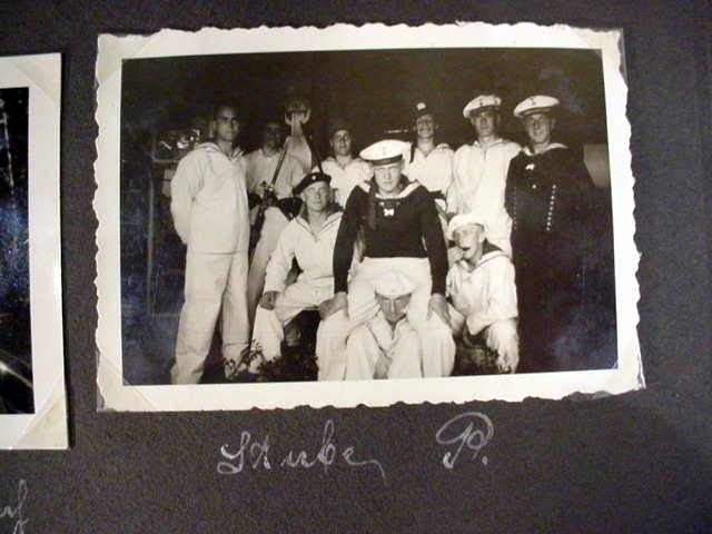 While undergoing repairs in Kiel, Emden was badly damaged by British bombers and was run aground outside the harbor and blown up by the Germans on May 3, 1945, to prevent the hated enemy from capturing the grand old lady of the seas. Her bow ornament is on display in the Deutsches Museum in Munich. The album is comprised of pictures of the training phases of her career the first page has a map and lists many of her training cruises. Then there are several pages showing pictures of Emden and a U-boat plus the famed four-masted training ships Horst Wessel and Gorch Fock. Then there is a page with pictures and two newspaper clippings about Captain L. Buerkner, who was known as Unser Vater (Our Father) by the “Blue youngsters” of the ship. The clippings are in English and the one long article is titled, “A Romantic Career.” The next charming picture is of the crew with its captain and other officers. It’s captioned “The Victorious 6th Cruiser Division with our Chief and we are looking forward to New Adventures.” Then this is followed by great pictures all with hand-written captions (often poetic) of the various cruises. Now and then a full-page, color photograph of the various strange places and strange people they visited. One has the caption “A wonderful tropical evening in Colombo was enjoyed in company with a Senegalese temple dancer.” Under these large, color illustrations are slips of printed paper in English explaining them. On one page we can see the formal funeral of one of the crew entitled, “The Last Parade.” There are two pages depicting the famed Neptune ceremony that is performed whenever a crew and ship of any nation crosses the equator. These pictures are hilarious. One of them is accompanied by a caption that says, “For dedicated housewives take: 1 spoon paprika pepper, axel grease, vinegar, shake well, and serve a refreshing cocktail, but be careful to prepare for constipation.” Many pictures of natives, Arabs, scenery monuments, etc., are present. One rather moving news clipping in English is seen along with a picture of Captain Buerkner laying a wreath at the foot of the British War Memorial in Ceylon. The recital is beautiful and the author prays for peace between Britain and Germany to prevail. Extremely rare are two visitation pictures of the Führer Adolf Hitler, himself, along with Admiral Raider officiating at the ceremony of the relaunching of the ship. There’s also a picture of Hitler and high officials disembarking the ship. Then there is the occasion of a cruise to India and Sumatra. Pictures of natives, another cruise map, pictures of local scenery in many climes. Then Norway, Finland, Sweden, etc. Some of these pictures are absolutely classic and beautiful. Many pictures abound of the crew in training and enjoying R & R, great picture of a U-boat in the North Sea, and, of course, pictures of sailors with a girl in every port. There is page after page of officers and crew enjoying ‘faraway places with strange-sounding names.’ There are pictures of the Argentine army in parade formation looking like mirror images of their German soldier and sailor comrades; pictures of the Sphinx and pyramids; visits to Arab lands; another original photo of Adolf Hitler, and the caption says: “The Führer boards the Panzerschiffe (armored ship) Deutschland. There’s a nice picture of a sailor of the training ship Gorch Fock and a picture of the ship; a wonderful picture of the ship’s ‘bug’ (its coat of arms) and the Iron Cross masthead; a beautiful picture of the marine, Garrison Kirsch, in Wilhelmshaven with the emblems of famous ships around the alter; pictures of assembled sailors of the Third Komp with several individual group pictures. Present is another news clipping heralding the arrival of Emden and the spectacular welcome by the plane of the Royal Navy’s HMS Emerald. Several more full-color pages are loosely found at the back of the book. This is one of the largest and most complete albums that we have ever found dealing with an important German ship of the line. All pictures are intact. The album cover in leather is very tattered and part of the spine is missing, but like the ship it stood the test of time and the entire interior is in great condition. This should be in a museum archive or in the collection of a responsible collector, who will realize the importance of this rare volume. The album measures 15 x 11 ½ inches and is 1 1/16 inches thick. We won’t undertake to count the pictures, but suffice it to say there are hundreds and all are prodigiously important and extremely interesting. We priced it most reasonably in the hopes that it finds a good home, but bear in mind its importance and realize that the candid pictures of Hitler are worth more than the cost of the whole album.