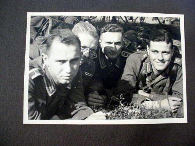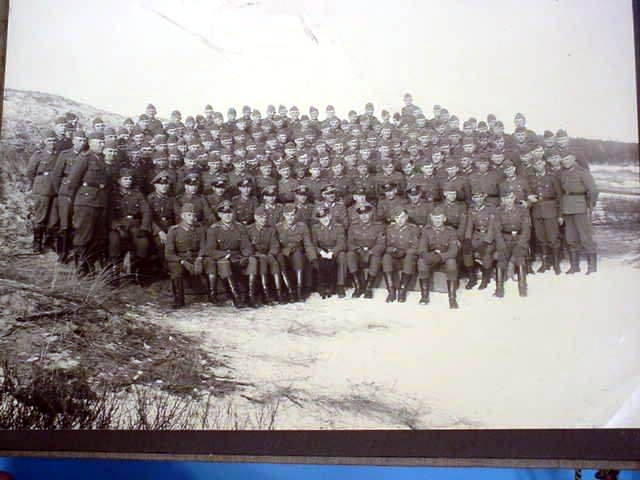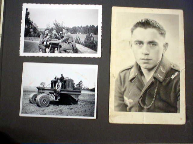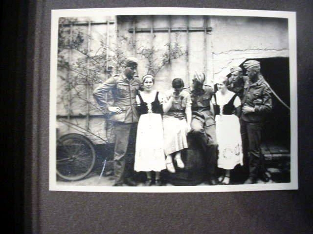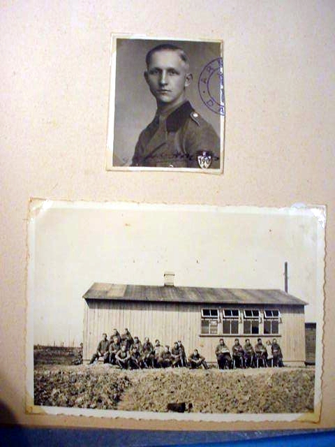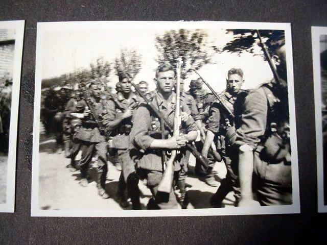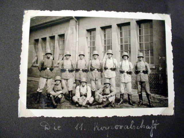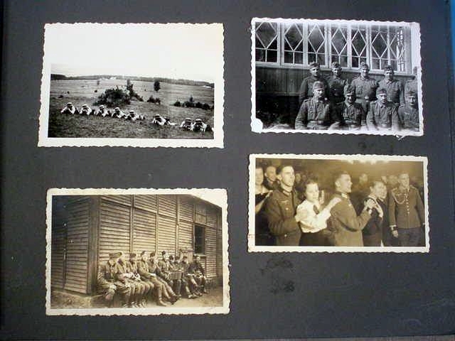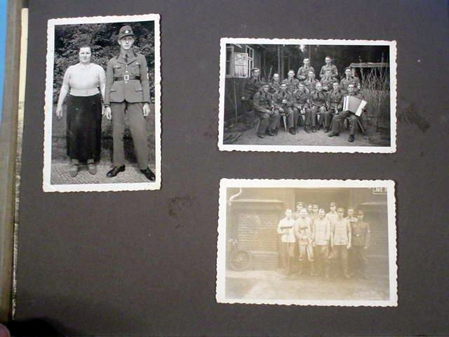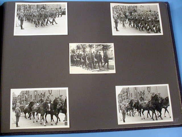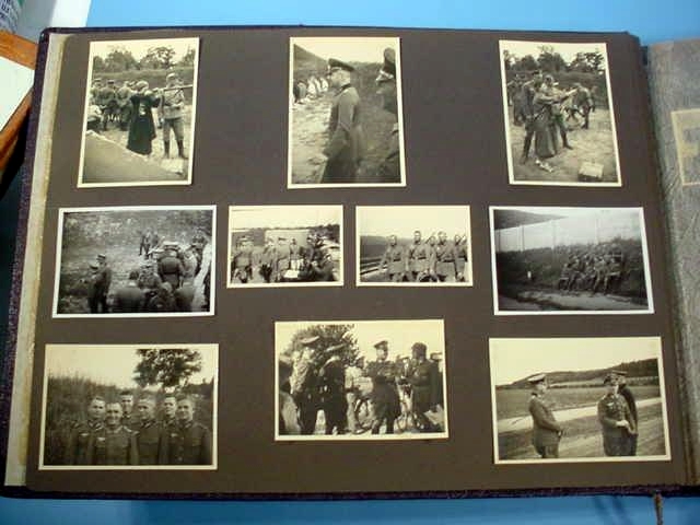 The pictures depict scenes from when he was a recruit with one where he is being issued his uniforms along with other recruits right up through his getting the famous army hairdo. A humorous one shows him or a buddy learning to pee while dressed in overcoat and tunic. Quite a few pictures of troop inspections and comradely posed photos. There are several pictures of the unit on the march and a great one