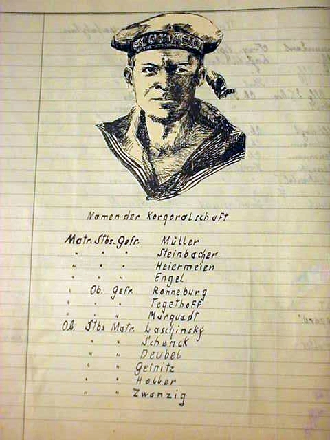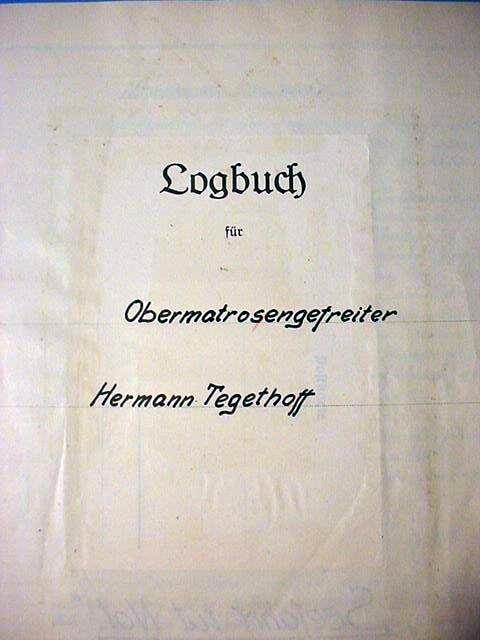 This hard-bound notebook consists of about 30 pages of writing with the most charming hard-drawn illustrations done by the log’s owner who was the sailor Hermann Tegethoff, who held the German rank of Obermatrosengefreiter (senior seaman first class). The logbook is a history of his service on this famed ship of the line the SSS (Segelschulschiff, sailing school ship) Gorch Fock. It begins with a dramatic picture of the ship that Hermann had pasted in the inside front cover and around the picture he drew the black, red, and white colors of the Third Reich with two swastika flags: one civil and the other the Reichskriegsfahne (war flag). Next there is a drawing depicting the ship in a storm and under it is the sailors’ motto (Seefahrt tut not!) roughly translated ‘sea travel through anything!’) Then there are several written passages with photos and lists of officers with a great depiction (drawing) of a typical German sailor along with nomenclature of the ship. Next is a great, rare photo of the launching of Gorch Fock 3.5.1933 in Hamburg. Next he writes of the beginning of his training starting in 1936 and this goes for several pages with some pictures of ship life. He then talks of voyages to Sweden and Russia and he makes a drawing of the flags of these countries with more photos of the ship and its maintenance, then more history of his service, more ship pictures, a trip to Flensburg Marine School with a photo of the building along with a map he drew of the German/Danish border known as the Flensburger Förde. There are more drawings of possibly himself at work aboard ship, more about Flensburg then a charming page of his illustrations of comrades of the crew at work followed by a picture hand drawn on a whole page of sailors at work before the mast, then a great drawing of the crew at parade rest, the Korporalschaft and their corporal, then two more pages of text that comes to an end 20/3/1936. This must have been the end of the tour and his training. This is indeed a living history of one of the brave sailors who ‘go down to the sea in ships.’ I hope he survived the terrible war and here is the true testament to his memory and the memory of the beautiful stately ship Gorch Fock.