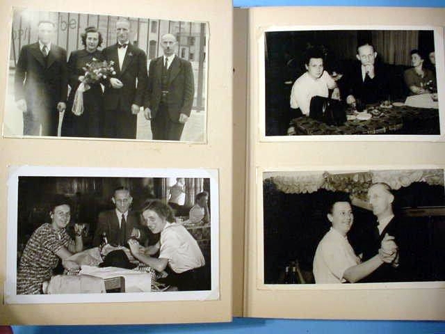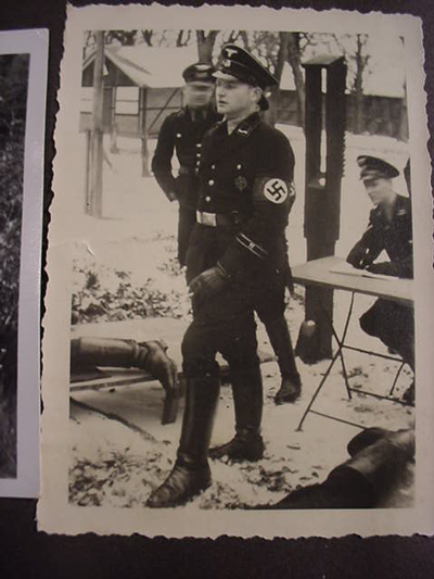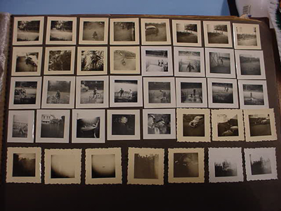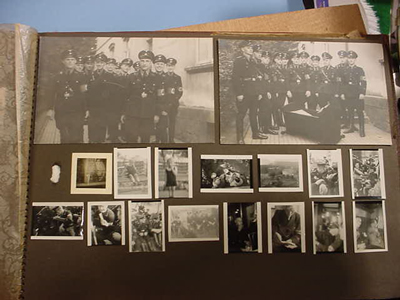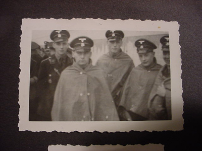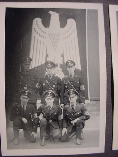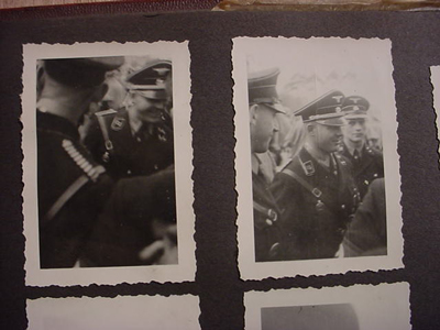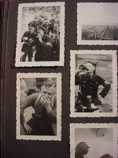 The school comrades giving the Heil Hitler salute and a picture of an SA officer (the owner’s father?). Then pictures of presumably the owner in Allgemeine SS uniform on a motorcycle with side car, and then some great 5" x 3" photos of him (possibly) at a switchboard, typing, and in a stockroom where all the equipment is stored, gas masks, fur packs, ammo containers etc., then 8 more of the larger pictures of combat exercises are seen, then there are 170 of those postage stamp size photos that you only see in albums of the 1920’s or 30’s -- about 1 inch square. They occupy several pages and are interspersed with other larger pictures, some of them are very interesting when viewed with a magnifying glass. There is a great couple of photos of a special SS ceremony in 5 ½" x 3 ½" size. Several beer drinking sequences and some great group poses plus what looks like the beginning of a baby baptism with the traditional baby crib of the N.S tradition shown.