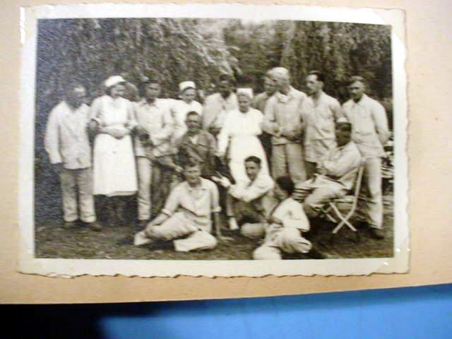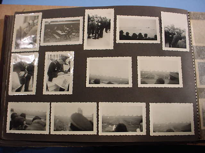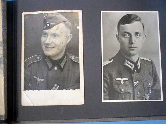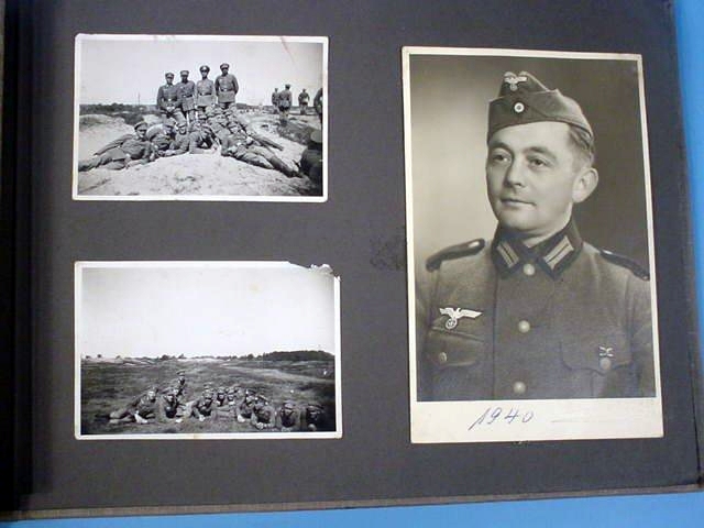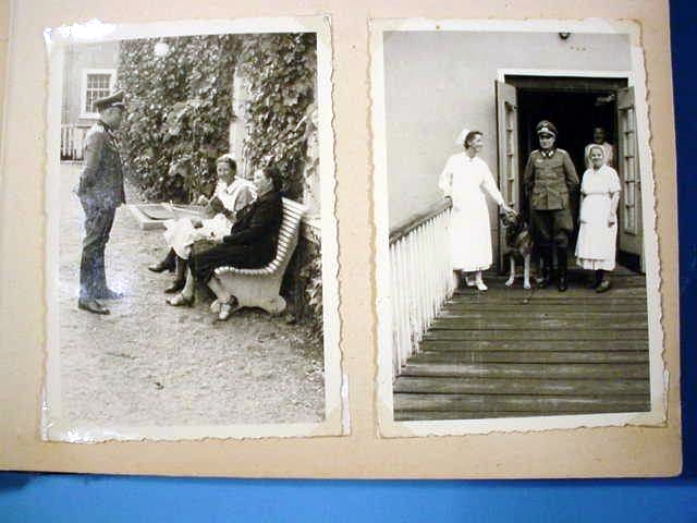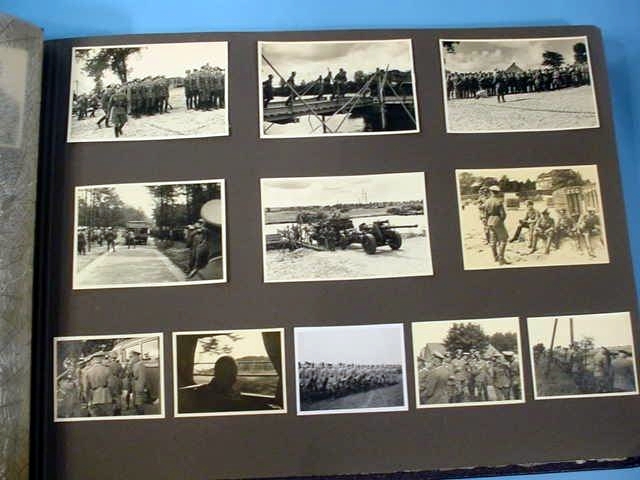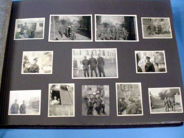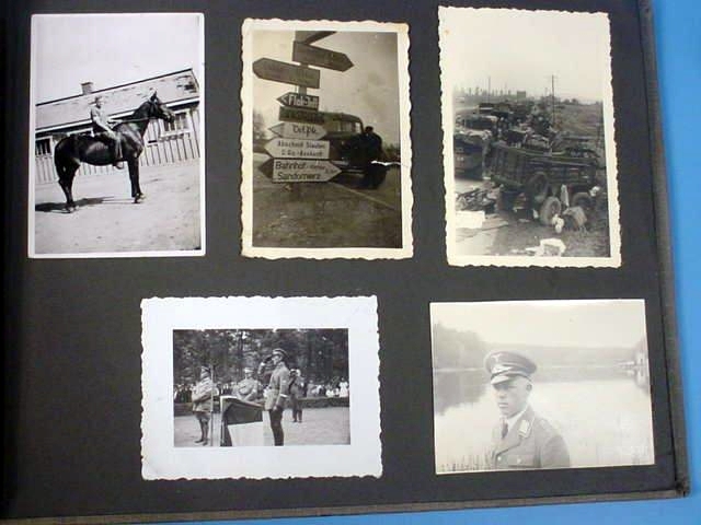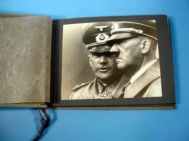 DESCRIPTION: Here is a typical album that chronicles a German family which lived in the era of the Third Reich. From the pictures we can deduce that they were the owners and administrators of a publishing firm. In the first pages we see several pictures of individuals who must be related, and a large 4 x 7 photo of the staff of the publishing house in a group pose, and then several pictures that include pictures of one individual person whom we would assume to be the president of the firm. His wedding picture and several pictures of him at important business functions appear. Then there are several pages of pictures of family members doing their service in the RAD (Reich’s Labor Service), and then in the German army. There is an actual photo of Adolf Hitler as he was chauffeured in his Mercedes touring car; this is 100-percent original and, of course, never published. The photograph requires magnification to view the Führer, but it is so rare that one would have the security clearance to take such a photo. The photo shows an NSKK trooper saluting the car and its illustrious passenger. There are many photographs of army life and one great shot of a downed British fighter aircraft with German soldiers climbing all over it. One member of the family was in the Africa Corps and pictures illustrate that. One was a doctor and there are pictures of him with solider patients at a hospital. The last pages are of the family in the postwar years. The Hitler candid photo is worth more than the whole cost of the album.
