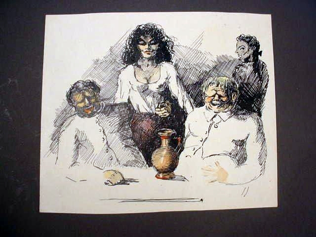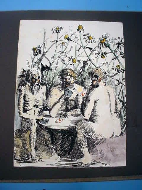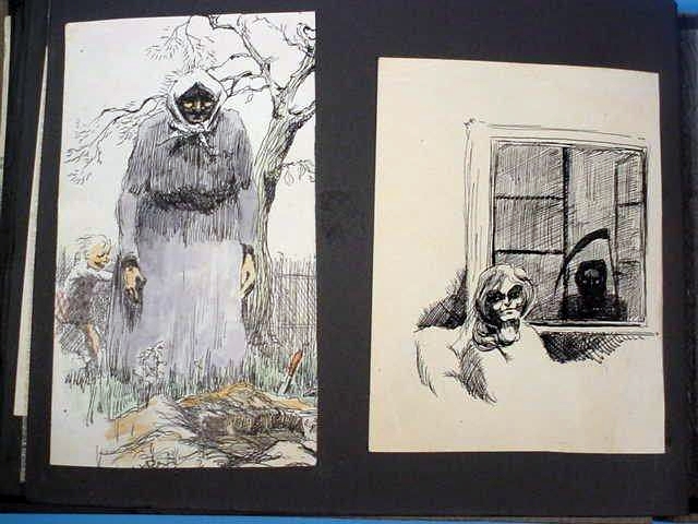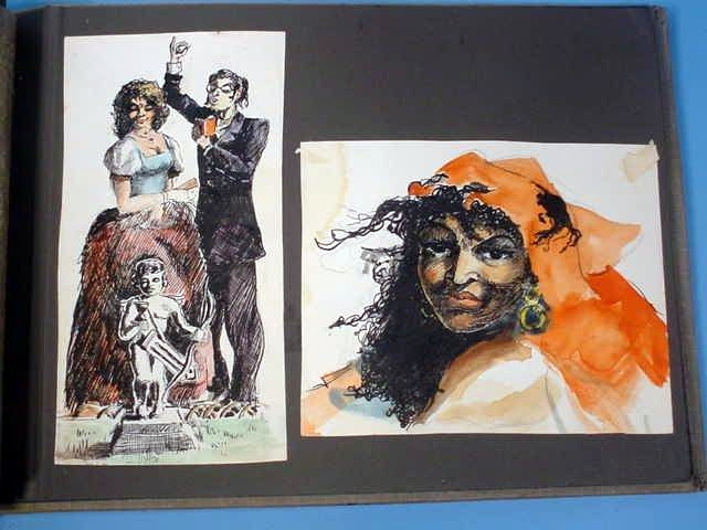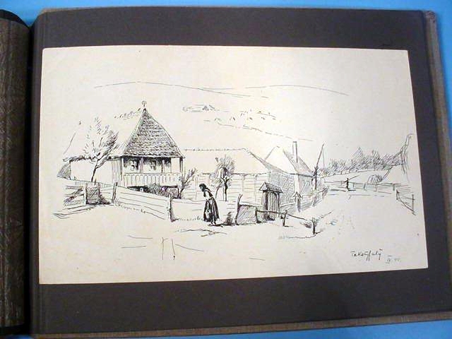 DESCRIPTION: This is absolutely the greatest military album we have ever found. We bought it directly from a surviving member of the soldier’s family. First of all, we will mention that it is the greatest cover of a soldier’s album we have ever seen; an artwork in itself with a high-relief eagle and swastika embossed on the front cover and a Stahlhelm laid upon a ribbon of the national colors (black, white, and red). Then in gilded letters it says Zur Erinnerung an meine Dienstzeit (“In memory of my service.”): All this on a beautiful linen cover. The first page has the photograph of the Führer Adolf Hitler with Generalfeldmarschall von Brauchitsch, and the next is a great group photograph of this man’s regiment followed by a photo of the soldier himself. He is seen on the left with his officer and friend on the right. Then there are several pages of photographs tracing his service; first, in the Labor Corps (RAD) and, then, several training-camp photos and one of his brother, who was in the Luftwaffe. There are some photos of him and his family while on leave and several more of comrades that he served with. Then comes the incredible part. This man was an accomplished artist and while he was stationed in the Balkans he turned to his fantastic portrayals of life in these regions. He depicts in his art dark scenes of death and doom, but they also mix with frivolity. His depictions of eastern gypsy life are absolutely true and vivid. The scenes of homesteads are accurate to the region. These sketches are the (originals), not copies, and they are actually the work of a very skilled and imaginative artist whose inner feelings obviously change in mood swings while engaged against a cruel enemy (vicious partisans) while he was serving in this dark side of the world. This is an actual treasure of both art and history. We believe it to be a vastly important archive item that should be carefully preserved for posterity.