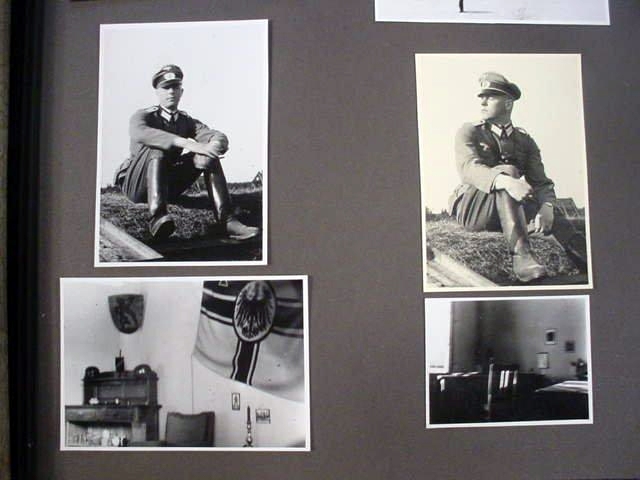 DESCRIPTION: Here is a great SS album. From the way the pictures are laid out we deduce that the officer pictured on two pages of the album must be the former owner of the album. He is pictured wearing the double skull collar tabs on each side of the collar, this style was introduced in 1939 for the newly formed SS Totenfopfverbande. So, this will show that the officer in the picture should have been photographed somewhere in 1939 or as late as May 1940 but actually some SS TK members continued to wear the double skulls late into the war. He seems to be an Obersturmfuhrer if the pips are but one - - however it is hard to make out if there is one pip and another device or if indeed there are two pips and then he would be a (Captain) SS Hauptsturmfuhrer. This album is truly historically significant and rather charming. It opens with a large picture of the officer’s wife or girl friend with a very cute little puppy. She holds the puppy in such a way that suggests she has mailed this to her husband or lover at the front.