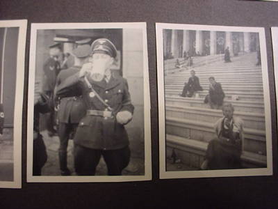 | DESCRIPTION: Question: Do you have any knowledge of how rare and seldom encountered are CANDID images of Adolf Hitler? He was possibly the most-photographed world leader of all time, but the images we see of him today were mostly professional ones taken mainly by his official photographer, Heinrich Hoffmann. This album, however, was put together by a man who was an SA (Storm Trooper) of some rank and standing. We bought it from his nephew who thought it should be shared by historians and collectors in the world rather than gathering dust in his closet in Nuremberg, Germany, where it was stored for the last 80 some years. The album is comprised of mostly photographic snapshots taken by this man at the Nuremberg Reichsparteitag of 1934, the annual Party Congress held at Nuremberg. The 1934 rally was named the “Reichsparteitag der Einheit und Stärke” (Rally of Unity and Strength) and it was the one party congress that was depicted in the fabulous film Triumph of the Will put together by the film genius, Leni Riefenstahl. Now the incredible fact about this album is that this SA officer was able to take 15 close-up photographs of the Führer that are seen on the pages of this album. This would normally be next to impossible as Hitler was usually ringed with SS uniformed guards and plain-clothed security service agents (SD). Only a man with high security clearance could ever hope to be able actually aim a camera at the leader and shoot such completely candid photos of him. You can see plainly that these images are completely candid and were never for publication by the very nature of them. At least one or two are actually a bit out of focus, which make this album semiprecious, indeed. No U.S. president since Abraham Lincoln has been even one percent as open in his public appearance. Hitler rode standing erect in his Mercedes touring car before hundreds of thousands of cheering admirers when he appeared for various events. This drove the SS and SD security people crazy, but he felt that his people loved him and we know he loved them so he continued to bare his body in these situations right up to 1944. The first candid photos are taken from afar and any German citizen cold take such photos, but the later ones in the album could only have been taken by a person with top-level security credentials. Along with the photographic record of the Reichsparteitag, there are a few pictures of the homeland in Germany’s Golden Age of the 1930s, before the horrid fratricidal war overtook the Fatherland. Everything in 1934 was sublime in the Germany Adolf Hitler had envisioned in his fulfilled promise to bring back prosperity to the German land and the essence of joyfulness and a beautiful form of heroic nationalism prevailed and this is reflected in the first full pages of the album where we see joyful occasions, river cruises, lawn parties, boating trips, etc., with jubilant and happy people enjoying themselves to the fullest while the ever-present swastika (the symbol of light! ) waves in the background. A really neat pair of pictures depicts a seagull sitting on the top of a swastika flag just like he was the actual finial of the flagpole and then in the next picture he flies forth as if to spread the word of the ‘Machtergreifung’ that was now finally a reality in heilige Deutschland. Then we see the preparedness for the Reichsparteitag and the first glimpses of the candid Hitler photos of as he arrives in Nuremberg to the thunderous applause of the hundreds of thousands of German people on both the sides of the street in the Nuremberg town center. Next, we see uniformed political-leader-corps functionaries getting ready to participate in the festivities. There is even a candid photo of Leni Riefenstahl, herself, descending the steps that lead to the tribune, and we see one of the Führer as he speaks from the tribune at night. This is followed by several pages showing all the glory and majesty of this fantastic event and then more Führer close-ups (real close-ups). He is greeted by children while accompanied by General Werner von Blomberg and other high-ranking officers. Following this are four wonderful photos of the Führer as he is escorted to the podium. Paul Joseph Goebbels and General von Blomberg are pictured here, also. The close-ups, I repeat, are 100-percent candid and unique and again the man taking these pictures absolutely had to be a very high official in the SA and possibly a friend in close association with Hitler. The photographer then takes some nice shots of ladies in traditional Tracht (regional dress) and at least two pages show the official visit of some highly placed political leader, and then more costume portrayals and regional celebrations. Then on two pages are four photos measuring 5 x 3 inches of Adolf Hitler as he mixes in and visits with some of the crowd. Here is proof that these were candid and not professional because at least two are just slightly out of focus. For publication purposes this just would never happen. After this—the last six pages—are the usual grandfather and grandbabies home photos. These are the most unusual pictures of the Führer we have ever seen in a private album and this is, in a word, precious, and in two more words, prodigiously important, to archival collectors— precious—but priced reasonably. Have you ever yearned for an actual one-of-a-kind original picture of Adolf Hitler; perhaps one like no one else has? Well, here is your chance to own 15 of them.