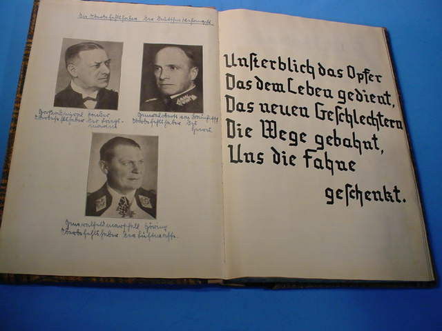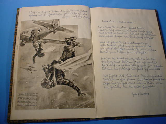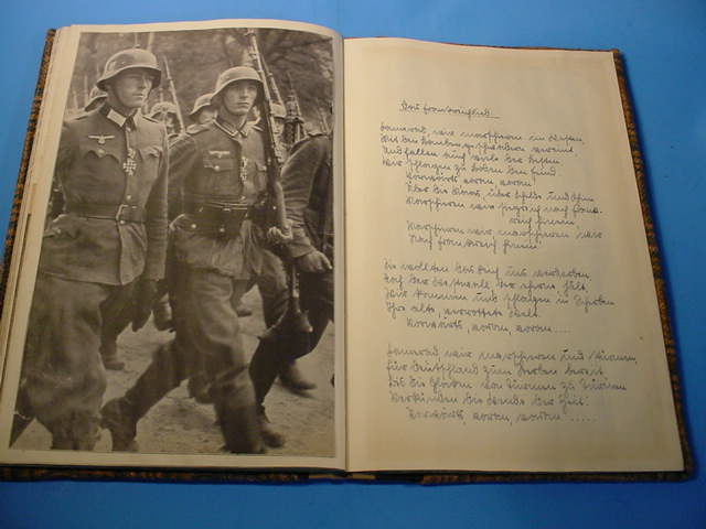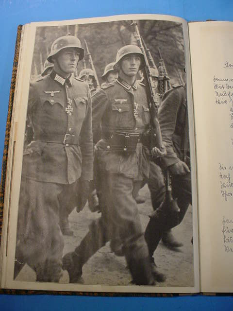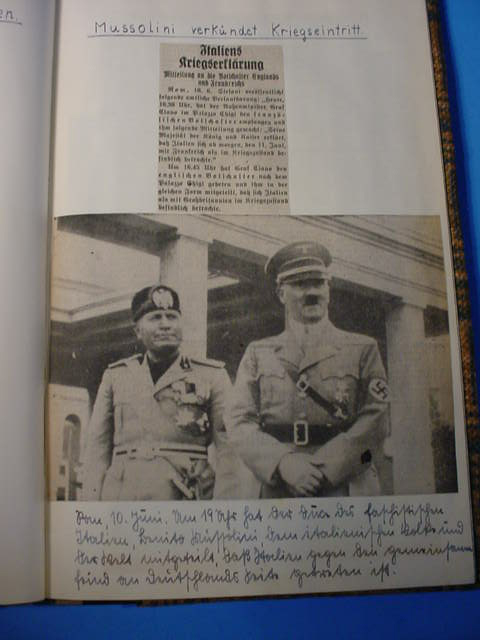 DESCRIPTION: This is a scrapbook that was put together from newspaper accounts and pictures in the late 30’s and the war years of the 40’s. The work was accomplished very artfully and neatly by a young lady by the name of Lisel Fröhling who was a young patriotic Fraulien who loved her Fuhrer, Volk, und Reich. She opens her Tagebuch (Daily book) with the official state portrait of Adolf Hitler with a poem by Heinrich Anacker. Followed by pictures of Admiral Raeder, Hermann Göring and Von Brautisch. Then she goes into a beautiful dissertation utilizing the beautiful handwriting style known as Sutterlin. This mode of writing was created by the Berlin graphic artist, L.A. Sutterlin 1865- 1917, who modeled it on the style of handwriting used in the old Chancery. It was taught from 1915 to 1944 and is still used by the old generation today. Heinrich Himmler for instance always wrote in Sutterlin. The lady goes into the Polish Field Campaign in detail in her own hand, and explains the Danzig situation with pictures and text. She then goes on to show period clippings and her explanation of the Norwegian campaign and all the other German lightening movements through 1940 of the Deutsche Wehrmacht. She quite naturally emphasizes the participation of women of the Reich as they do their vastly important work for this their nation at war against the Communist menace while supporting the soldiers of the Fuhrer. Page after page are filled up with earth shattering events of the monumental struggle, while all the while with her gorgeous handwriting explaining each segment. Troops, aircraft, boats, tanks and numerous pictures of the brave men and women are depicted in period news clippings. Cartoons showing the bloated face of the horrible war criminal W. Churchill and a shot of a French negroid (soldier) are sort of comic relief. A picture of the Fuhrer and Benito Mussolini is underscored with her comments and finally the campaign against France is covered briefly. The book closes with her writing in grandiose letters under the national eagle. “Deutschland will live and will gain the victory” (a quote by Adolf Hitler). This is what I would call important history with a great personal touch. The album measures 8 ½ x 13 and is covered in a fabric that is of the type used in furniture covering. There are about 88 action filled pages. Great!