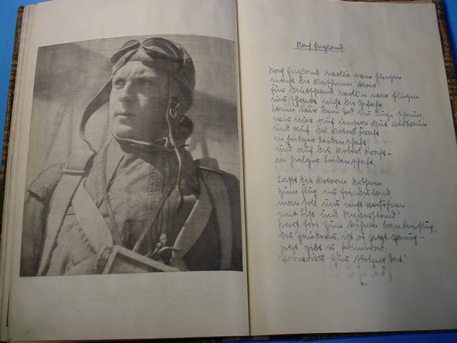 DESCRIPTION: Here is one of the best German Luftwaffe albums that we have ever seen. The picture of the airman who owned it is prominently displayed on its first page, but unfortunately he did not fill out the pages with his personal history. This is one of the deluxe albums with leather covering and a whole wonderful pictorial section with pictures of Adolf Hitler, Hermann Göring, and other top leaders of the Deutsche Wehrmacht. Then next you will see great pictures of the Wehrmacht in action at the Front, four pages of pictures of the Iron Cross series; and the other combat medals of the Third Reich. Then a dozen pages for entries having to do with the owner of the albums, deployments, promotions, wounds, and honors. Then there are 58 personal photos from the early career of this man. The spectacular part is that 88 percent of the book covers in actual photos his time spent with the NSFK, or Glider Corps. This, of course, was the clandestine training of future pilots in defiance of the ignoble Versailles Treaty that forbade Germany an effective air force. Actual pictures from this period and of this sequence of events are extremely scarce. After this we follow our hero to the time of actual motorized flight and we see some of the earliest aircraft and Luftwaffe uniforms. The pictures are mostly 4 x 2 ¾ in size except for the last two that are 6 ½ x 5. These two show a group an advancement ceremony, but, unfortunately, these are a little bit damaged. There are also two extra loose pictures in the 6 ½ x 5 size; one shows the outdoor ceremony and the seated recruits, and another shows the camp HQ building and Luftwaffe personnel at attention. A bonus is a ‘Fliegerkarte’ put out by none other than (BP) that is a detailed map of Germany especially mapped out in air routes with a beautiful color cover with an early single-engined aircraft. This is a great archival treasure considering its great rarity.