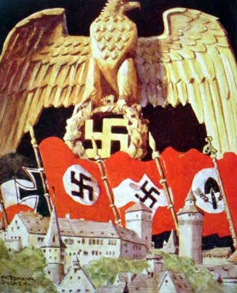 DESCRIPTION: Here is possibly the most beautiful, most rare, most interesting item of vast historical interest that we have ever handled. This banner is from a brass band that was formed in the area of Scholven. Here was found the vast and massive plan for the conversion of coal into gasoline. Had it succeeded and somehow escaped the night and day bombing runs made by the enemy (England and America), the outcome of the war might have been far different! The hydrogenation Scholven was purely a military operation. The fuel supply was meant exclusively for military purposes, however, as early as 1933 Hitler had announced in February that under his four year recovery plan public measures would serve to create jobs and the militarization would make Germany ready for war because he knew that Britain and France were looking menacingly at Germany to say nothing of the great danger that loomed in the Communist East. So with the placement of this four year plan to have Germany's people working again and to supplant an awareness in the people for the possibility of war, Hermann Goring is appointed as the Tsar of the great social and military venture. Gorings’ task in the context of this plan was to align the companies of the Reich and if necessary there would be government intervention in all production process within the agenda of the National Socialist economic policy in peace or war. Germany wanted to also be self-sufficient, completely independent of foreign supplies of raw materials. A most difficult task when one considers that at that time potash, lignite and coal were in insufficient quantity and crude oil was scarce so this led to the construction of hydrogenation Scholven in 1935 and the mining company Recklinghausen and mining company, Hibernia, are now subsidized and nationalized. For traditional reasons, the Hibernia Company keeps the name Hibernia A.G. (more lately). The goal of the four year plan is to use 10% of the coal for the experimentation in the methods of converting coal to petrol (gas). In July 1936., for the first time the Hibernia AG Co. has success in the production of gasoline from coal tar, three weeks later directly from coal. Hibernia decided after this pioneering achievement to actually make the first hydrogen production plant for the process. They are no longer just a mine they are now a full- fledged plant producing synthetic gasoline from coal. In 1938 the ministry of hydrogenation Hermann Goring instructs the plant to switch the production of 200,000 tons of gasoline for autos and trucks to 180,000 tons of jet fuel. So important was the Hibernia plant that at this point an entire huge community of workers with government supplied housing was established and social events were planned and acted upon by happy workers. The symbol or logo of Hibernia was the Prussian eagle holding in his right claw a sword and in his left, lightning flashes. In the center of his chest is seen the swastika of the Reich and under the eagle is a black scroll with the name Hibernia! -- under this you will see a four leaf clover or shamrock, placed upon the crossed hammer and chisel that has been the traditional logo of German miners for centuries. The mining community had its own local newspaper and in 1937 a poster that hung in plant work places, offices and workers mess halls showed a JU-88 Stuka dive bomber that has this Hibernia symbol shown on it. Reichsmarshall Goring made quite a few official visits to all the hydrogenation plants and especially Hibernia. He expressed his lively satisfaction at the high level of production development that had been reached there. Wherever Goring went, extremely jubilant people gathered to greet him while chanting Unser Hermann -- Our Hermann. Hibernia and the other mining communities in the Scholven Gelsenkirchen area were as patriotic National Socialists as could be found in the Reich. In 1932 nearly 40,000 people were out of work in the economic crisis, in 1939 the employment offices of the city reported only 100 people unemployed. The industrial companies complained of a labor shortage; the people had good cause to be thankful to the National Socialist Party and especially the four year plan manager Goring. Every National Socialist event in the N.S. calendar was ceremoniously honored and celebrated to the absolutely fullest extent. The Fuhrer’s Birthday, the observance of the Putsch in Munich, and the Machtergreifung ascension to power by the National Socialists party. There was a sharply dressed musical band who played the Horst Wessel Leid to symphonic excellence and that is where our bugle banner comes in -- but first let’s look at the first origins of the name Hibernia and its use in N.S. Germany. The name of course is the classical Latin name for the Emerald island of Ireland. But how does it come to be used in Germany? Did you ever hear of the expression “Coal to New Castle”? The Irish who wanted to invest refused to invest in the English coal industry in the 1800’s because to the patriotic Irish, England was the ‘traditional enemy’ so they looked east and since there was always a great predilection between the Irish and the Germans, several Irish entrepreneurs decided to actually sink shafts in the Gelsenkirchen area and there were two other mines besides Hibernia...the Shamrock and the Erin...and by 1800 they were united under the name Hibernia. The first man to actually open those mines was a Victorian Irish gentleman by the name of William T. Mulvany 1801-1885. We mentioned earlier that it was by tradition a word scared to Germans (real Germans) that the Hibernia name was preserved even in the Nationalization of the industry. And this tradition is surely the reason the shamrock was made part of the N.S. banner and probably myriad other objects. The banner is double sided with the eagle and shamrock on one side and the other side has the swastika on white circle with red background. The eagle is absolutely gorgeous with