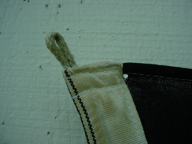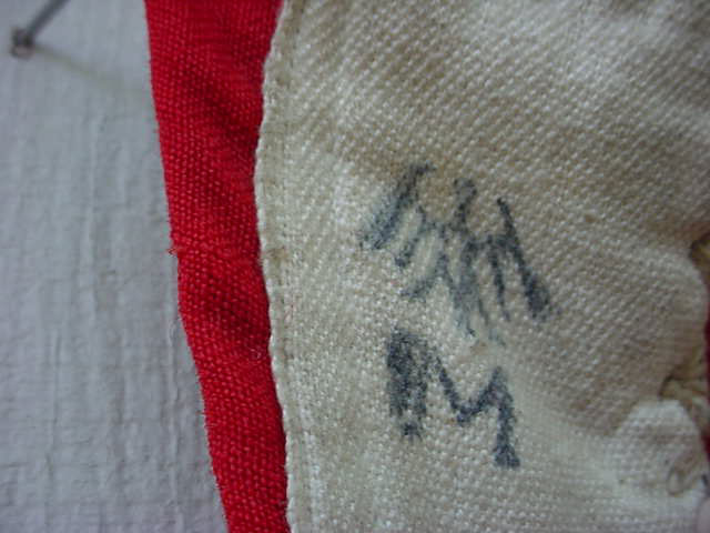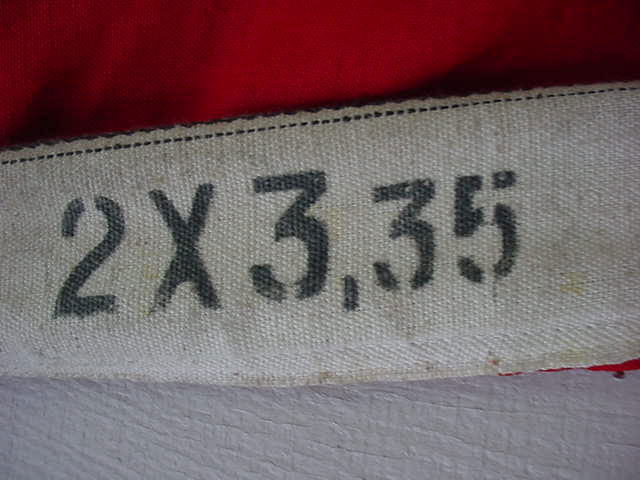 DESCRIPTION: This one is in good shape and has rope and clip attachments for display on a pole or hooks on the wall. It is single-sided, so it is not a true flag. Rather, it was for display at an SA Sturm headquarters. This is the typical size and construction piece used as stated or even on trucks and personnel lorries that were used on early SA missions. The size is 40 x 30 inches. There are a few old stains in the white field, but they really don't detract from what is a nice memento of the Kampfzeit.