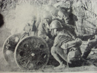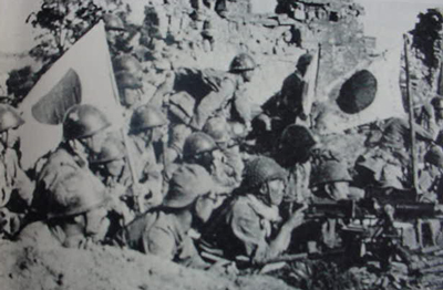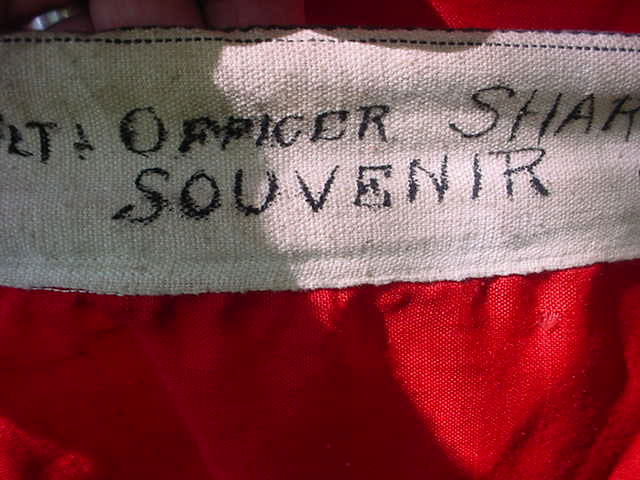 DESCRIPTION: This is the traditional battle flag of the Japanese WWII forces that was to them known as the personal battle flag. Know to the American army soldiers opposing them as the "Meatball." The Japanese soldiers carried one with each soldier for nationalistic and ideas based on religion and the Order of Bushido (the way of the warrior). The flag measures about 25 x 45 inches and has leather tabs at the hanging end. It bears stains and one rip under the risin sun center, but it is still a very good war souvenir of the Pacific War. PRICE: SOLD |