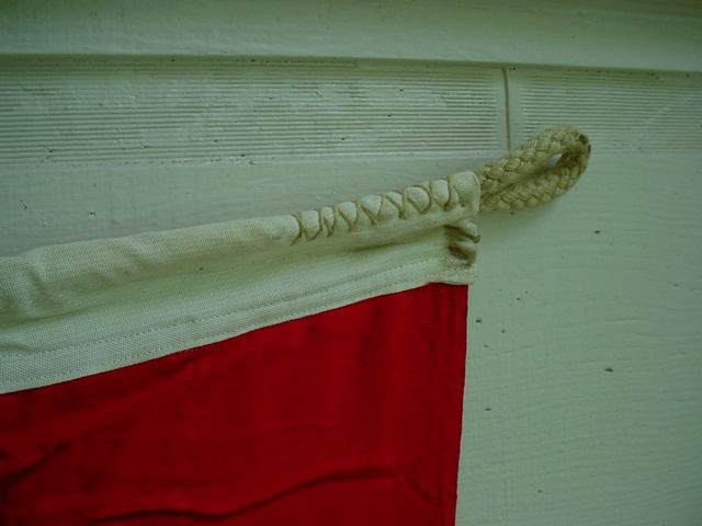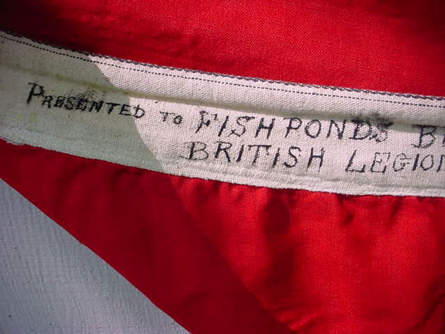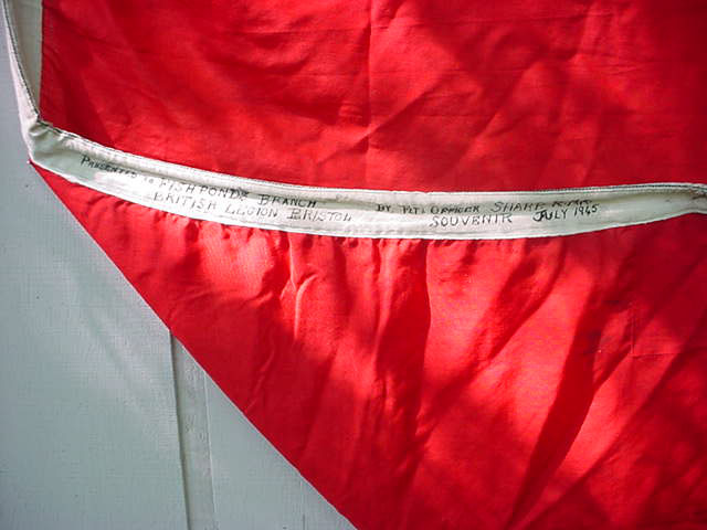DESCRIPTION: Seldom do you ever see these little gems available. It measures two feet by 13 inches and it is in perfect condition with no moth holes even though it is more than 80 yrs old or older. It has the reinforced bunting border with the rope attachment. It has no stains at all (unusual). The piece could be from the Imperial Period 1914-1918 or it could be a veteran's piece produced from 1918-1940 or so. It is a flag, not a pennant; the usage of which we are not sure, but this is a real little charmer. PRICE: SOLD |