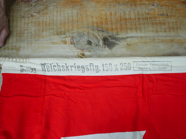 DESCRIPTION: Here is a specimen in nearly mint condition of the Kaiserreich battle flag. We are not sure if it was manufactured in the period leading to or during the First World War. It could have been produced in the 1930's or 1940's. The Veterans Associations used this ensign in all their parades and ceremonies. The condition is great and it has the label of the flag maker on its rope edge. It is a great size for the collector (53" x 31") and is a very dramatic looking flag. It has the rope running through the left side (stitched on) with the loop and tie lanyard all there. The Banner Fahne Fabrik was known to make the finest in flags and standards in the Imperial era and in the Third Reich (they made the best!) PRICE: SOLD |