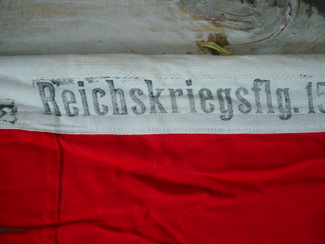 DESCRIPTION: This is an original period German Reichskriegsfahne (military flag). This one is the ideal size for collectors – 3 ft. 10 inches long by 2 ft. 3 inches wide made with the regulation linen material. It is in great shape throughout and has the sail cloth bunting edge with lanyard rope for fastening to the pole. This was the size used on submarines and also landing craft that carried marine infantry units. Just a great little flag! PRICE: SOLD |