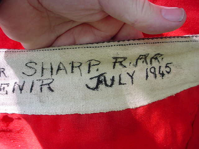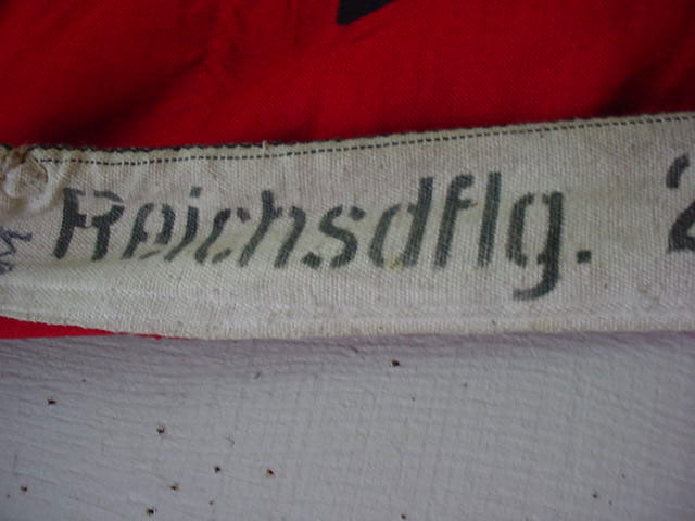 DESCRIPTION: This is the style of flag that would hang upon flag staffs of post offices, universities, police stations, and government buildings of all types. For some reason they are much more scarce than the Reichs Kreigsflagge (War Flags). This is an excellent example with a few minor moth holes and some type of white stain that is definitely not easily noticeable. It has the German markings ‘Reich D Flg’ for ‘Reich’s Dienst Flagge’ (Reich Service Flag). Then we have the foreign matter!!! Along the edges of the banting it has an inscription that tells of its presentation to a British (VFW) style veterans post by a RAF officer who brought it back from the fratricidal war in July of 1945.This rubbish is only on the bunting so it doesn’t seriously deface the flag in any way really, and there actually are collectors that would think this addition to be ‘romantic and cool’. We would rather it was not there but maybe that’s the Scottish and German in me coming to the surface! All in all a pretty impressive item.