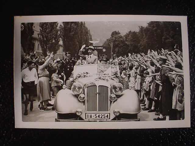 DESCRIPTION: This is a 3 ½ x 5 ½ photo of Doctor Goebbels as he enters the Tirol Lands in Austria. He is greeted by the exhalent crowds as always. He was very popular with the Germanic peoples. This was probably a photo with limited circulation as it seems to be an actual photo printed on postcard stock. A nice historical study
