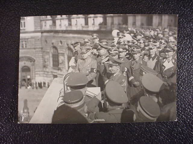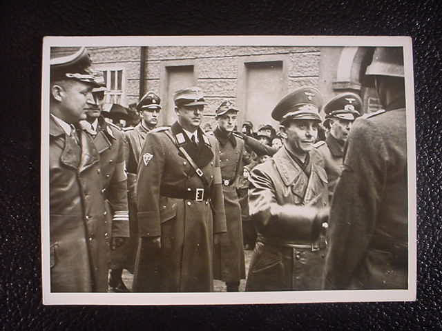 DESCRIPTION: This is an important original picture of historic value. It depicts Dr. Goebbels as he steps to the podium to deliver the Austrian Ansuluss Speech. He is surrounded by various German and Austrian officials and political leaders plus military officers from various branches of the Wehrmacht. This is an important picture 100% original. The picture is stamped on the back with the identification that it is from the photographer Wienbud (photo for press and propaganda) It measures 7 x 5 and it’s clarity is outstanding.