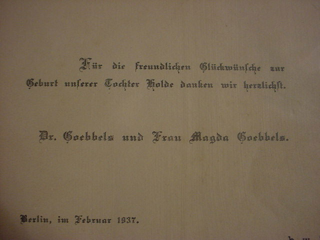 A card thanking well wishers for their recognition of the birth of daughter Holde in 1937 (Item GOEBBELS 3-13) |