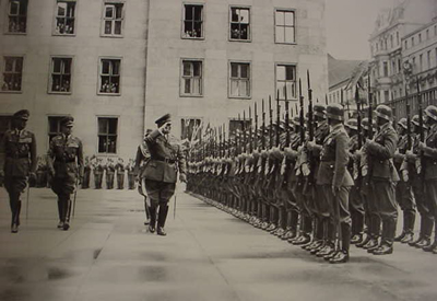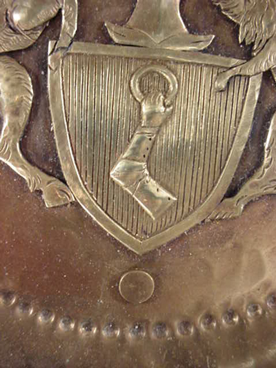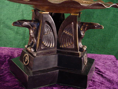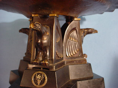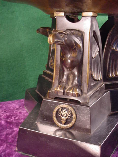 DESCRIPTION: This is without doubt a great Hermann Göring relic. This is a magnificent compotier (compote) that was from the private office of the Reichsmarshal within the Luftwaffe Air Ministry in Berlin on the Wilhelmstrasse. This building was a classic example of Third Reich architecture. The mosaics and statuary plus paintings inside were breathtakingly beautiful. They say Göring's inner office was utterly fantastic and being familiar with his artistic taste we would have to concur although I know of no book that has pictures of this magnificent office. It has been said that the decorative motif was similar to his hunting cabin in East Prussia only more refined. The Russian looter, who took this compote in 1945 in the fall of Berlin, spoke no German and when our picker from Nuremberg bought it from him, he could not shed any light on the scenario. The piece was bought at a Berlin flea market just after the Berlin wall came down. The Air Ministry was formed in April 1933 from the Reich Commissariat for aviation, which had been established two months earlier with Hermann Göring at its head. In this early phase, the Ministry was composed mainly of Göring’s personal Luftwaffe staff; it was later comprised of many departments dealing with several facets of air travel, construction, training and staffing and all of the central command of the Luftwaffe. In 1934 an additional department was added, the Luftzeugmeister (LZM) in charge of logistics. With the rapid growth of the Luftwaffe following the outbreaks of WWII in 1939, the Ministry grew so large that Göring was no longer able to maintain control of this period and was marked by an increasing inability to deliver the new aircraft designs that were desperately needed, as well as continued shortages of aircraft and engines. In 1943, Albert Speer took over from Erhard Milch who was the state secretary for aviation and things immediately improved; Speer was able to cut through the rigid hierarchy and make needed changes almost overnight, aircraft production shot up, and projects that had been hampered for political reasons, like the Heinkel HE 219 UHV, were finally able to proceed. So much for a capsule review of the history of the building and its functions. The compote was defininetly from a luncheon or tea-time table set within Görings office and like everything else that belonged to him, it is again Classic. The Reichsmarshal in his architectural predilection tried to make everything reflective of himself. His jewelry even brought forward this theme. His favorite jobs within the Reich government were his supreme command of the Air Force and his office of “Reichsjagermeister,” Chief of German hunting. The decoration of this compotier brings out in its design a suggestive mode with the three eagles in bronze from stylized letters that look like a (D) signifying flight emerging as the future of Deutschland. At the base of each eagle is the badge of the Reichsjagerbund, the National hunting Association, that Göring founded. This was the stag head (St. Hubertus style) with the swastika of the new Reich. In the center of the dish portion is the full Göring crest. This was handmade and adhered by a master craftsman. The crest includes the armored arm that clutches the ring. The helmet of a knight with winged crest that employs again the armored extremity holding once more the ring, a stag and a griffon are the supporters of the crest. The whole of the dish is in bronze with the eagles underneath acting as a magnificent plinth. It is supposed that a porcelain plate possibly was fitted from time to time when refreshments would be served when special guests such as Lord Halifax, Italo Balbo, Charles Lindberg or the Duke and Duchess of Windsor were in attendance. Such scenarios were regularly held not in the grand ballroom but actually in the comfort of the office. Göring was a very personable man who loved company, so this grand item I would say possibly was used very often. We were lucky that the Russian preserved it so it could be brought back to us who appreciate it so profoundly. This truly is one of the finest Göring items to surface in many years. It is our fervent hope that more of these pieces in this marvelous pattern will still show up with the Russia picker. Hopefully, taller examples of the same fantastic design will appear.