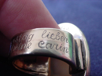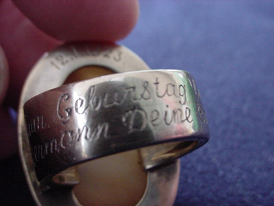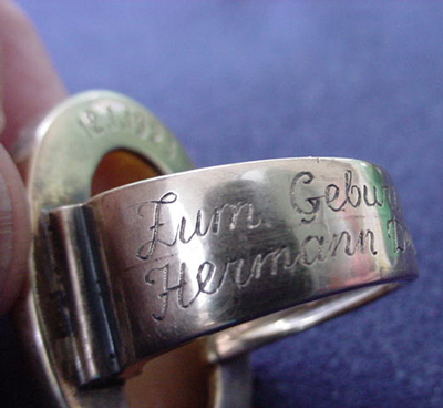 Goring was born Jan 12, 1893, and she presented the ring to him on his birthday a couple of days after they were married no doubt so that he could wear it at the various wedding celebrations that followed for weeks thereafter. The inscription translated reads: For your Birthday Dear Hermann from Your Carin. The ring is beautiful in its presentation and certainly massive. It measures in ring size about 11 and made for a big man. It is in 18k gold and is heavy. The carving is very excellently accomplished on a perfect cameo shell. It is certain that Goring treasured this token from the wife who he also treasured. It is more than probable that receiving this ring contributed greatly to his passionate penchant for acquiring many diversified rings. There are pictures of him wearing many different patterns of rings, many that he designed himself and had them made and assembled by his main jewelers Zeitner and Franz Schnell. But it is doubtful that any one of them ever meant more to him than this ring from Carin. We were told that he did not wear this ring after Carin died fearful of ever cracking the cameo. He placed it in a shrine to Carin that he had in his residence in Kaiserdamm Berlin in 1931 and later in his estate in the Baronial hunting Lodge which he built in 1933 in Carin's honor. It was there that he had her body re-interred from her original grave in Sweden in a funeral attended by one of her greatest admirers, The German Fuhrer Adolf Hitler.