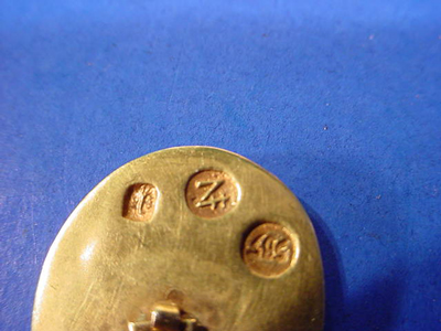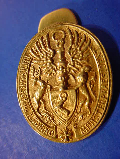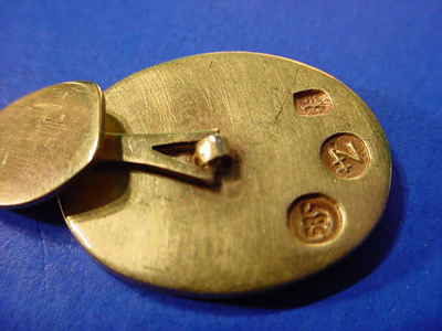 He was a Master Jeweler and this is precisely why he was chosen to design many art pieces for Hermann Goring. This included rings, pendants, daggers, presentation boxes, paperweights ,etc. The Goring crest, as seen on the cufflinks, was completely designed by Professor Zeitner with Heraldic advice from the Reichsmarshal himself. His crest turns up on rings and pendants that once belonged to this “Modern day Falstaff” as Goring was often called. The crest is quite beautiful and contains the winged arm whose armored hand clutches a golden ring and below this a Knight’s tournament helmet that sits upon a shield that also contains the armored arm with the ring holding this shield. To each side of the shield are a stag on one side and a lion on the other. At the bottom, suspended from a ribbon, is the Pour le Merite (Blue Max) that Goring won in WWI as an ace fighter pilot -- 22 confirmed kills. Around the edges are the words Reichsmarshal “H. Goring Minister President.” While on the back there are 3 deeply set stampings; the main one is the (Z) for Zeitner with his logo including the slashes on the tail of the (Z). The next mark is something that looks like a scorpion or a crab -- this could be the mark of the sub-contractor who actually manufactured the cufflinks. The last mark is a (585) which is the German marking to indicate that the item is equivalent to 14 karat gold. The links have a fine hinged fastener that goes through the cuffs to secure the jewelry to the dress shirt cuffs.
