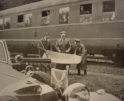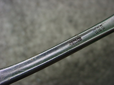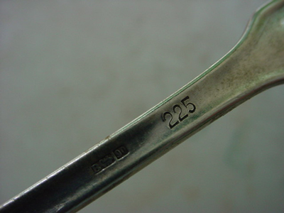 DESCRIPTION: The author James A.Yannes points out in his recently published book, The Collectable Spoons of the Third Reich, that Hermann Goring (Reichsmarsal) had two personal trains. His primary private dining car was #10243 (243) for short. Other cars were 233, 234 and 244 and are usually marked with a capital (B) for Bruckmann with a locomotive symbol followed by the numerals (90). Tthe demonstrably different shape of the Goring flatware is evident when set side by side with the A.H. DR. spoon in our Hitler pages (AH 25-8). And is generally described with raised edge. The number assigned and seen on this fork is 225 and it is a good assumption that this is the number of the car used by the huge Goring staff who always accompanied him including Field Marshals and Generals of the Luftwaffe. The fork is 7" long and is in great condition.