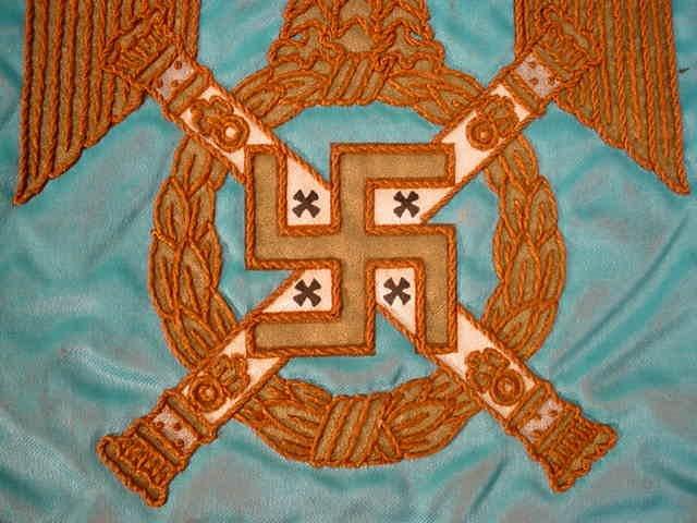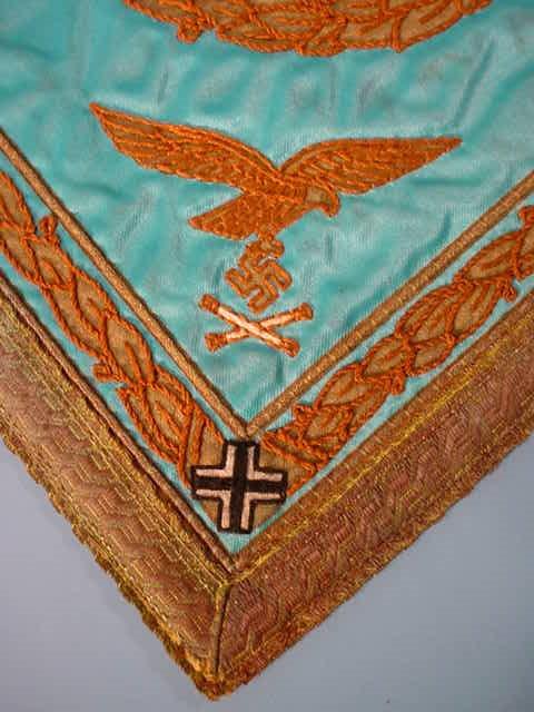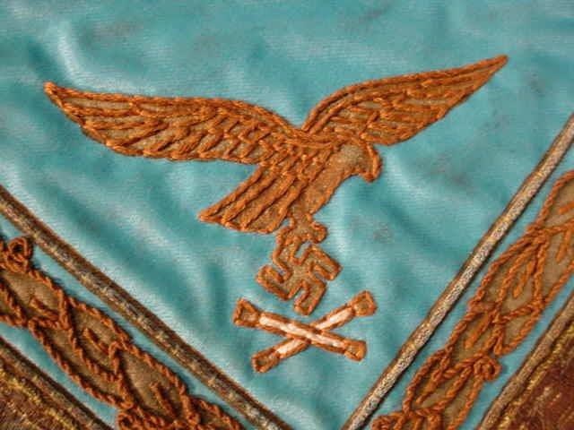 DESCRIPTION: Here is one of the most important pieces of German embroidery we have ever encountered; practically nothing can touch it for sheer historical value. After all, next to a genuine Göring full-sized unit flag, or an Adolf Hitler standard in full, gold bullion, I would have to say that this auto pennant has to be one of the greatest items to be offered today on any site or private collection. We have found a site offering a Hermann Göring Reichsmarshal ‘pennant’ and the asking price is $58,000. This site is Military Collectibles, Inc. (militarycollectiblesinc.com), a firm that has had a good reputation and many fine items offered, but for some reason the pennant it has does not seem to have the color usually associated with this piece when you see it in original German manuals, etc., and it is a far cry from the color of the one we offer which we know to be genuine. Ours was bought out of an auction that recently offered the collection (the fabulous collection) of the recently deceased Mr. William Blynn of Ohio. Mr. Blynn was possibly the most well known of collectors worldwide who gathered only the most spectacular historically important pieces. He collected over a 50-year period and he will be sorely missed in the relics field. His sentiments and political opinions were always on the far right and virtually politically incorrect in “the first degree!” He truly was an “Alpha Germanophile” who vehemently and bravely stood up for Germany against any silly detractors. Please go to Heinrich Himmler’s Great Chair and look at the footnote regarding one of the chairs that came from the Mr. Blynn’s collection. The Göring auto pennant was certainly one of the pieces he cherished most of all. And why wouldn’t it be? Certainly it is one of the most rare and colorful of all the many beautiful items Bill had and that recently have been offered at various auctions that his heirs have foolishly entered and offered them up for sale—the collection should never have been broken up. The Göring pendant (Command flag) would have originally been in a protective plastic case that snapped over it as protection against inclement weather. The piece measures 12 x 12 inches. On one side all beautifully embroidered is the Reichsmarshal’s eagle that surmounts two marshal’s high-dress batons with a nonmobile swastika in the center. In the four corners are seen Baltic crosses typical of the Luftwaffe that was of course founded and headed by Hermann Göring, himself. All around the edges can be seen fine embroidery that looks like oak leaves and at the outer edge is fine geometrical design finely embroidered. On the reverse side in the center is the WW II Iron Cross with its edges done in silver-bullion thread with a swastika and the date “1939.” (That date commemorates the founding of that austere award in its WW-II form.) Around this is a golden wreath surrounded by four golden Luftwaffe eagles all carrying crossed batons in their claws. Again, we see the Baltic crosses in the corners and the rest of it is identical to the obverse side. Hermann Göring was appointed Reichsmarshal of the German Reich in a 1940 decree by Adolf Hitler, thus making him second only to Hitler’s position as Supreme Commander of the nation and its Wehrmacht. Even before this he was the second most powerful man in the NSDAP (Nazi Party). During the early days of the regime Göring continued to take on serious responsibilities and titles including President of the Reichstag, Reich Minister of Aviation, President of Prussia, SA Supreme Commander, and, of course, Commander in Chief of the Luftwaffe. On the first day of WW II Hitler gave a speech in which he stated: "Should anything happen to me in the struggle then my first successor is Party Comrade Göring . . . " This status was underscored when he conferred the rank of Reichsmarschall upon Unser Hermann (Our Hermann) as the German populace had nicknamed him. Up to that time and of course never since has such power and magnitude ever been bestowed upon any German official. The sumptuous pendant really spells out the glory of that ponderous and exalted office—the pennant might well be worth what Military Collectibles, Inc. is asking for the one in its possession. However, we are pricing ours in accordance closely with what it was purchased for in auction. Had my late and lamented friend Bill still been around and considering the price of this treasure if he was even willing to sell it would easily be well over $100,000. It is that important for sure. We, however, like to pass these treasures along to genuine collectors while realizing a reasonable profit. It was a lucky thing that it ended up in an auction that was not particularly known for handling such material and we were able to procure it at a bargain price and now will pass it to you also at a very reasonable price along with our official certificate of authenticity.