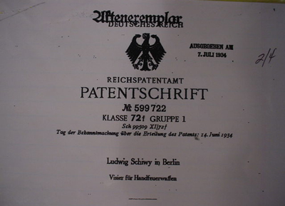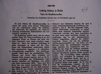 # 5 the rear sight- This is an interesting innovation that shows up in this rifle for the first time in 1934, the year that this rifle was presented, the sight was patented on the 7th of July 1934 and was invented by Ludwig Schiwy in Berlin. What it was designed for was to vastly improve the hunter's ability to sight in on running game. It is comprised of three dovetail shaped cutouts, the two side notches (left and right) gave more side visibility on hastened running shots while the center notch was still usable in the normal way for shooting at standing targets. We have a copy of the Schiwy patent papers from the 1934 Reich's patent office. Ludwig Schiwy was, also one of Görings favorite gunsmiths and could possibly been one of the men who helped to produce the Suhl masterpiece.