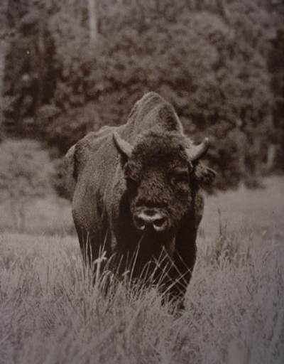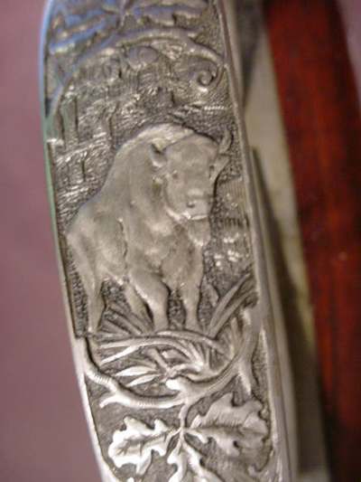 # 8 The end of the stock has a rubber butt plate. We do not know if this was original equipment when the gun was to be presented but one thing we do know is that if this gun was fired 3 or 4 times in succession it would seriously abuse one’s shoulder if the rubber butt plate was not there. I can testify to that (I have fired it). This weapon with its 9 x 74-R shell packs a ‘super wallop.’ Göring undoubtedly used it for hunting big game, moose and bison on his private game preserve at the Reichsjägerhof Rominten near the border of Poland. Interestingly Görings favorite game animal was the Polish bison or “Wisent.” It was in the Polish Bilowieya forest that Göring hunted these European bison. In 1938 he is known to have hunted these great animals along with the Polish president Mosciski but after the forest fell into German occupation in 1939 Göring who was now the Field Marshal intended to make the Bilowieya forest into the biggest international hunting reserve in the world. Later he imported many of these magnificent creatures to Rominten in the Rominter heath *Note: the engraved Bison on the trigger guard of the rifle and the engraving is so fine that you can distinctly see the difference in this Bison and the Buffalo of the American plains although they are definitely related.