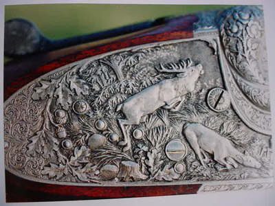 From circumspect extrapolation, we believe we can pretty safely assume that it was Richard Werner who did the exquisite engraving on the rifle. We will borrow the words of the subtitle of Henrick Fruehaufs book to say “Who else could it be?” If the weapons city of Suhl wanted to present a special gun to this man the favored patron of the shooting sports would they have used any other when Richard Werner? It wouldn’t be tortured reasoning to make such an assumption. Another assumption but well founded is that the gun maker was a special model and was begun as a basic J.P. Sauer rifle. But anything but basic is the fact that it was not made in the factory and the gunsmith was very probably August Peter who was an independent master gun maker in the city of Suhl. He made almost all of the special models for the Sauer Company. We have deduced that the construction of the weapon began in 1933 but was not finished until 1934. There is some information that the gun was born as a model # 33 Sauer before it was modified and it is more than probable that August Peter did the modifications, once the city of Suhl decided to present the rifle to Hermann Göring. There is no manufacturer's name on the gun but the absence of a name is not at all unusual. In the 20’s and 30’s in the city of Suhl, the presentation gun trade for the most part was pursued by a professional gun guild whose members were dedicated to not only making the weapons but also making positively sure that the precision and quality was worthy of the city and the gunsmith trade within Stadt -Suhl. The guilds were known to bring together the greatest of the craftsmen engaged in this noble and prestigious occupation once a special presentation piece was planned.