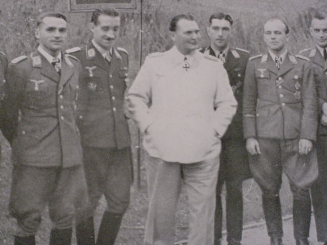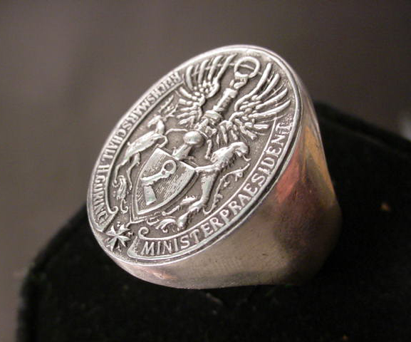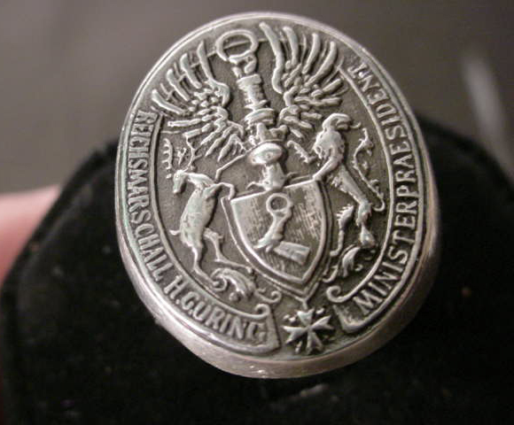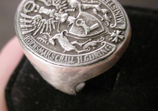 DESCRIPTION: This is a ring in silver that bears the full family crest of Hermann Wilhelm Goring who at the time of its designing was the Minister President in the German State of Prussia and of the Reich. This was in the early years of the Third Reich; In July 1940 Hitler promoted Goring to Reichsmarshall Des Grossdeutschen-Reichs, a special rank which made him senior to all Army and Air Force Field Marshals. It also reinforced his status as Hitler’s chosen successor. Goring was known for his extravagant tastes and spectacular clothing. My personal friend the ace Stuka pilot, Hans Ulrich Rudel, recalled twice meeting with Goring when his chief was dressed in elaborate colorful clothing. First a medieval hunting costume while practicing archery along with his doctor and the second time dressed in a russet toga fastened with a golden clasp, smoking an abnormally large pipe.