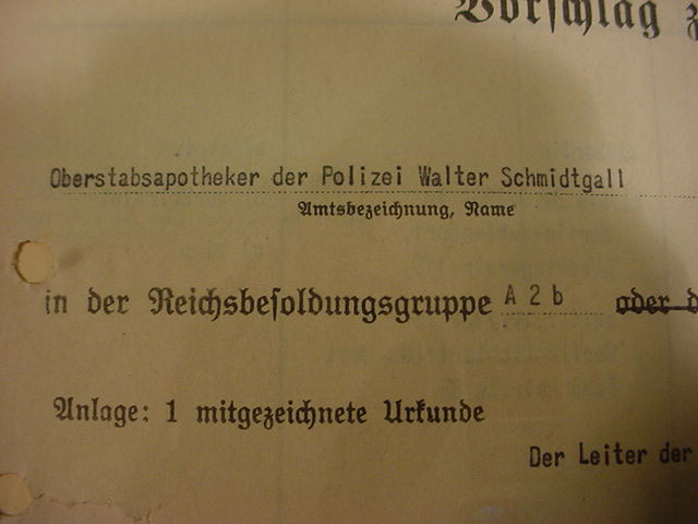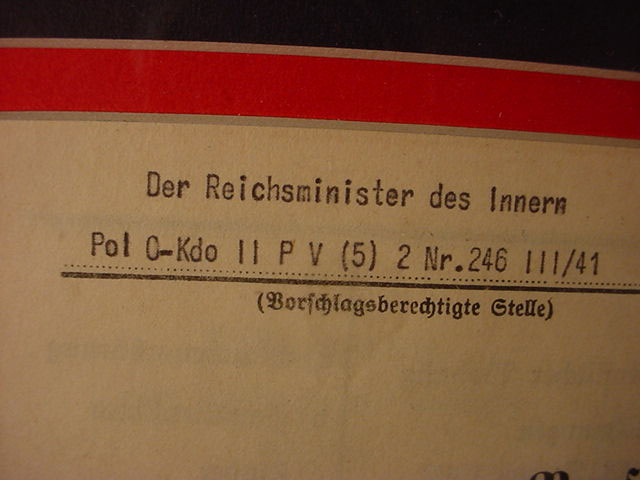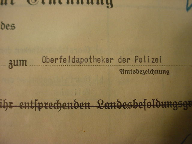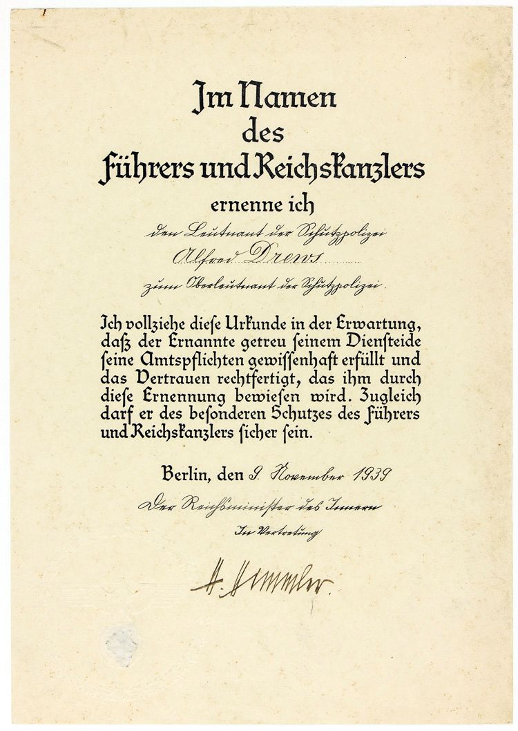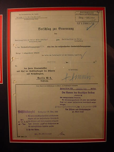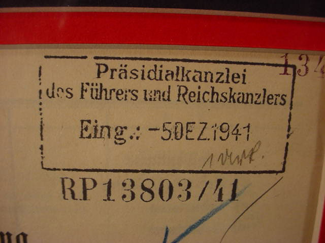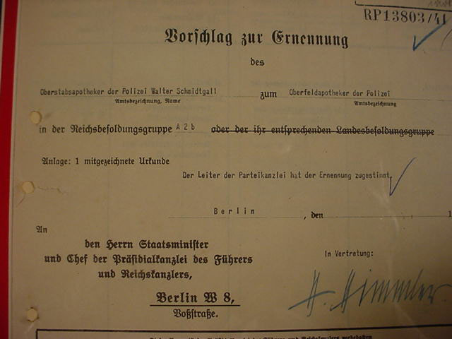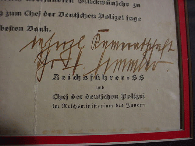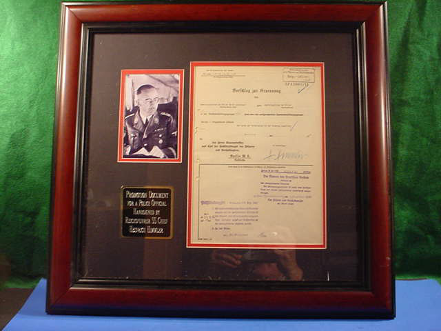 The document from Berlin in 1941. It is a prodigiously important document in that it went through the office of the Fuhrer and ReichKanzler (Hitler). It comes first from the Reichsminister of the interior who of course was Himmler and he signed it boldly in his usual green pencil. It is clearly marked with the stamp of the Chancellor and this being the Fuhrer through his offices and there is an official stamp. Proclaiming "in the name of the German people etc. etc.” and says clearly Fuhrer Hauptquartier 9th December 1941 authorized by Der Fuhrer and Reichskanzler Adolf Hitler. It is for the promotion of Oberstabsapotheker Der Polizei Walter Schmidtgall. To Oberfeldapotheker Der Polizei. This officer was a dispensing chemist within the ranks of the Police. An interesting and obviously important document that has survived the awful carnage of war. It has been carefully preserved and is framed with special non-glare glass with acid free mounting throughout including the matting. The frame measures 21- 1/2 x 20 the actual document measures 8 x 11. This one has it all!