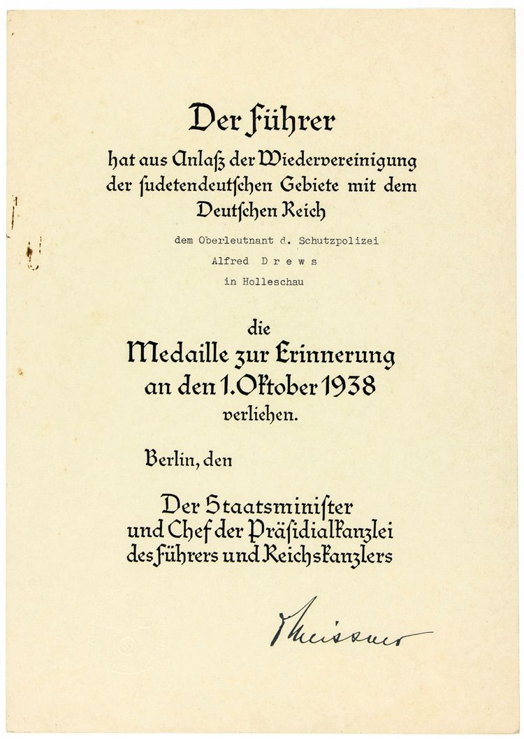 DESCRIPTION: This is just as stated for an officer of the SS. It’s in excellent condition. It reads as follows: The German Reich represented by the Reichs Minister of the Interior represented in turn by the Reichsführer-SS, draws up the following service contract with SS-Hauptsturmführer Theodor Wisch. SS-Hauptsturmführer Theodor Wisch agrees to serve uninterruptedly as a Führer (leader) in the SS-Standby Force, in accordance with the law for regulations and directives in effect for the SS-Standby Force, until completing the 45th year of his life. Upon completing the 45th year of his life, the service contract will be renewed on a yearly basis unless notice is given three months before the end of the year. The first year of duty as an SS-Führer will be a probationary period. During this year, the contract can be terminated at any time by the Reichsführer-SS after giving three months’ notice. A justification for this termination is not required; it has the force of law; An objection cannot be filed. Berlin, 28 June 1933 Signed by: Der Reichsführer-SS H. Himmler PRICE: $500.00 |