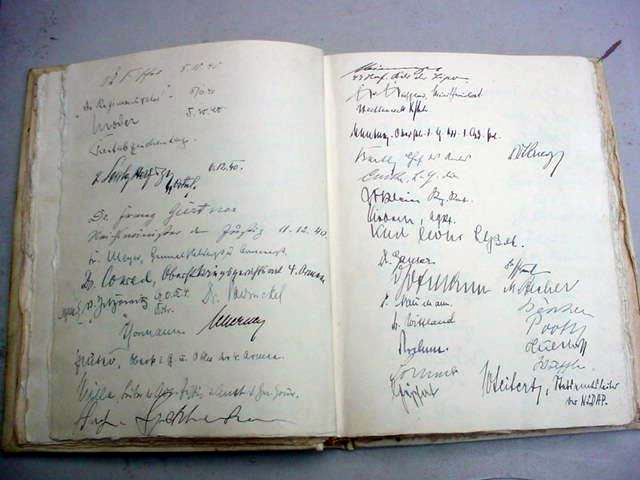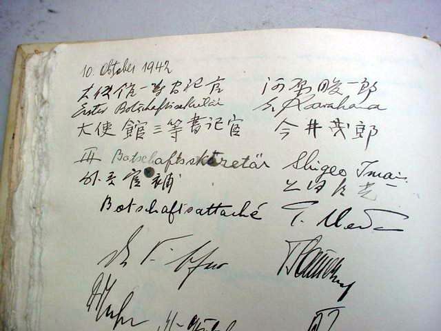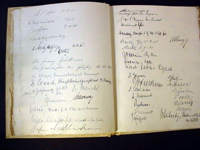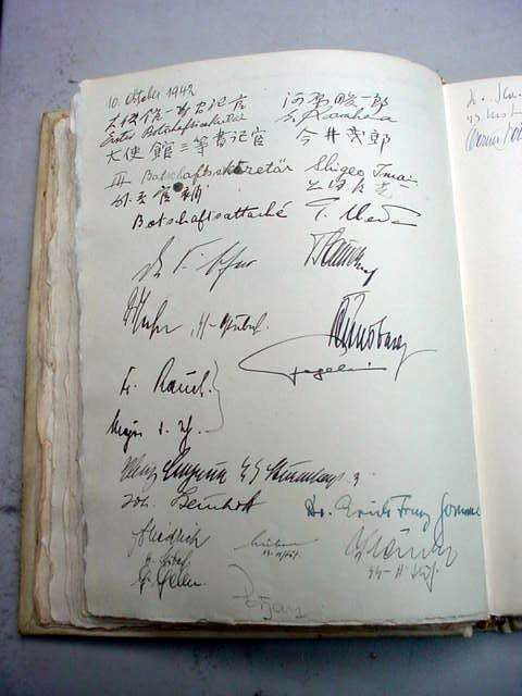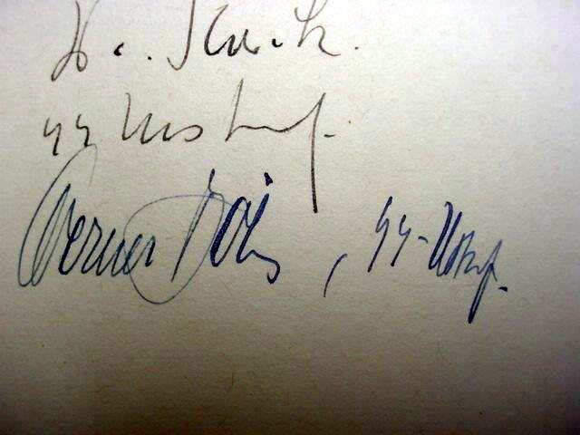 DESCRIPTION: The book is by Werner Jansen and is titled Das Buch Liebe published by Georg Westermann in Braunschweig with copyright date of 1920. It comprises 304 pages. The cover is in green cloth with gilt title on the spine, and a small tear on the edge of the spine (fixable!); otherwise, fine. This is a presentation to Heinrich Himmler, inscribed to him on the front flyleaf with: “Oberwachtführer of the Rote Kreuz (Red Cross) Ilse Doehring with friendly greetings November 1940.” Beneath this Himmler has added his ownership signature: “H. Himmler.” This epic saga was dedicated to young women whose men were at the front during WWI. The author, Werner Jensen, and this work were very dear to Himmler’s heart in 1924. After first reading it Himmler declared this book, “. . . the songs of songs to the Nordic woman.” He said, “This is the ideal image we Germans dream of in our youth and are ready to die for as men.” (‘Very good’ and historically important to the extreme.) It shows the obvious sentimentality of the Reichsführer-SS. This is not only revealing, but Himmler's signature is one of the boldest and best of his that we have ever seen. He was obviously proud to own this book.