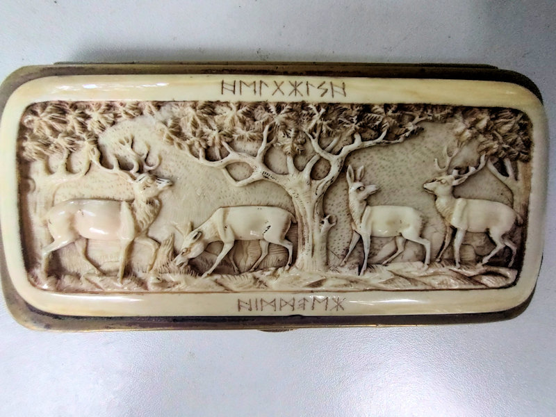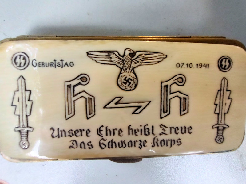 DESCRIPTION: Das Schwarze Korps (The Black Corps) was the second largest political weekly of the Reich. It was the organ of der Reichsfuhrung-SS. They were monthly issues keeping the membership up to date with SS issues. The editor, Gunter d’Alquen, was already a very professional journalist when he took the reins of the journal. Under him, the SS paper frequently attacked liberals, intellectuals, leftists, atheists, scientists, woke, etc. Gunter, as a hobby in private, loved to carve in wood and ivory and here we present an exclusive carrying case for the Reichsführer for private introduction cards. Gunter personally carved from ivory such a case and presented it to the Reichsführer on his birthday “07.10.1941.” The front of the case has some exquisite earlier carving worked with the runic alphabet depicting wild stag and doe. This work is not by our SS carver. He wasn’t that good. The case is probably a lone antique that he bought and embellished; however, the back panel of the case has some words and declarations making it a birthday gift to Himmler. The top design bears the SS naturalized, stylized eagle. Below this are two lowercase letters representing Himmler’s initials; between them is the Wolfsangle. Below this is the motto of the SS “Our Honor is Loyalty,” and below that is Das Schwarze Korps. At each end of the case is the symbol of Das Schwarze Korps: a Teutonic sword lain across the SS rune symbol. The item is in very fine condition with a little bit of usage inside. Certainly, it is one of a kind!