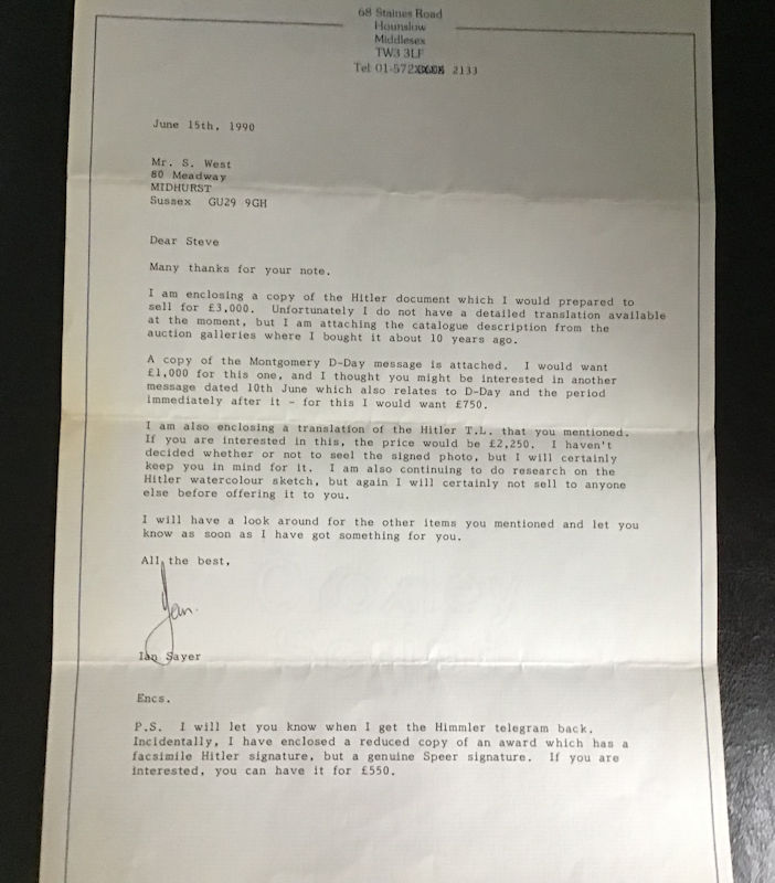 DESCRIPTION: This is a hand-written letter written by Adolf Hitler and sent or handed over to the future Reichsführer of the SS, Heinrich Himmler, who, at that early time, held the rank of Reichsleiter. Hitler and Himmler passionately shared academic interest in the importance of race and its crucial basis for all the endeavors of mankind; for instance: the superiority of the Aryan race and the inferiority in their mutual genetic opinions of other races. Thus, this letter has strikingly historical importance and is not only one of the rare, full-page letters in existence that is written out by Hitler, but because of its theme, it may be one of the most exceedingly important ones yet discovered. Here is a rough translation of the letter: My dear Reichsleiter, dear Party Comrade Himmler! The improvement of the bloodline in a whole race is an important work of our National Socialist Politic. We cannot come to conclusions about a race before we have judged its achievement. For today all the very best to you and your work. Munich, Dec 25, 1932. (Signed by Hitler in the recognized style of his signature for that period in his life.) It is our considered opinion that Hitler was answering a letter from Heinrich Himmler in a continuing discussion on racial hygiene so crucially important in the Third Reich. Signatures of Hitler are considered very rare and of momentous importance to museums and collectors worldwide, but the fact is that a full-page letter like the one offered here is just a remarkable discovery, indeed! To say that the content of the message is any less than of great and sublime content would be almost absurd. The obvious reference to the teaching of racial heritage that was daily promoted by the Hitler Youth and can be exemplified on its members’ belt buckles and blades of their camp knives by the words: “Blut und Ehre!” (“Blood and Honor!”). The letter is written on a parchment-looking paper and measures 11 1/2 X 8 inches and is in excellent condition. As a historian who specializes in Third Reich history and who researches important memorabilia of the period, we must say we cannot imagine anything quite as noteworthy as the emergence of this archival gem from the past, as it now has done. PRICE: SOLD |