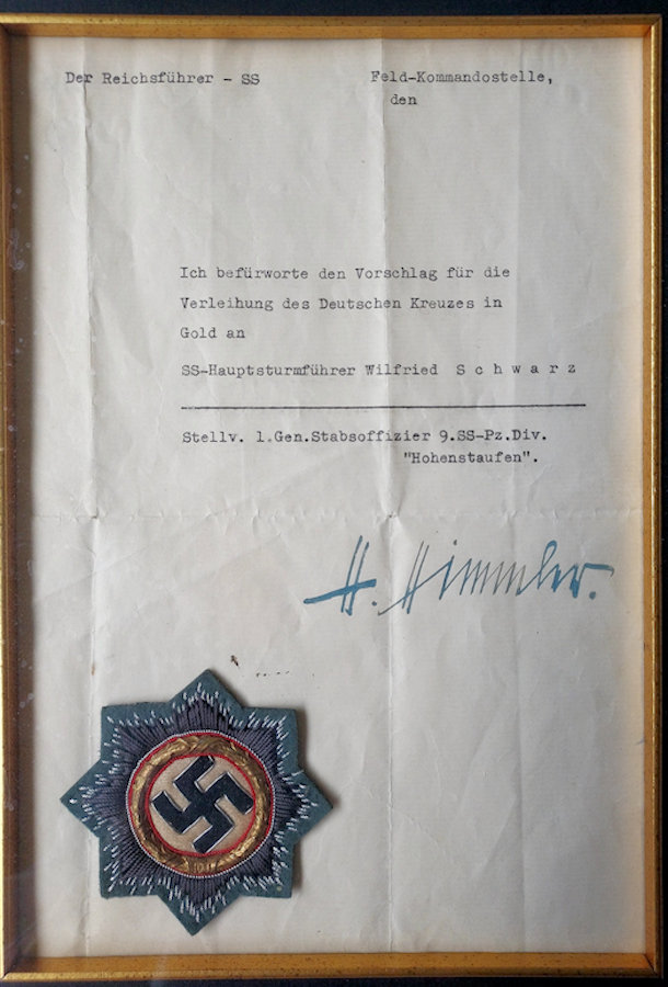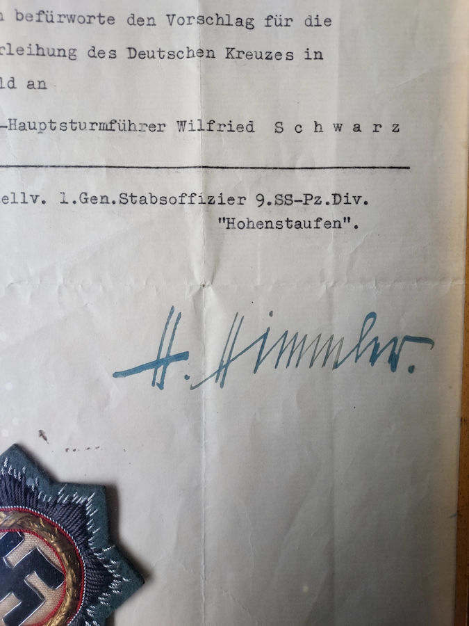Field-Issued Award of the Deutsches Kreuz in Gold: signed by Heinrich Himmler (Item HH 4-21) |
