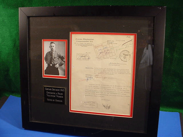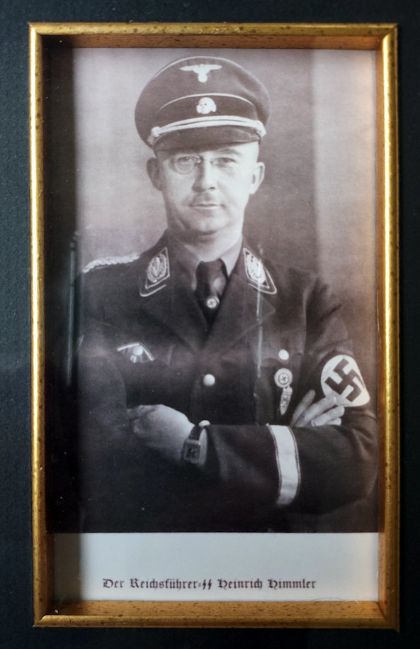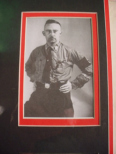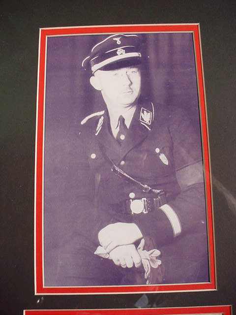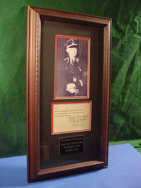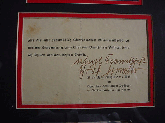 DESCRIPTION: In June of 1936 Adolf Hitler appointed Heinrich Himmler as Reichfuhrer SS and completed the centralization of the various criminal police departments in Germany into the Reich criminal police office (Reich Kriminalpolizeiamt) Himmler appointed in turn Reinhard Heydrich chief of the secondary police main office (Hauptamtsicherheitspolizei); this office includes both the Gestapo and criminal.office of the SD and this also centralized the uniformed police forces, known as the order police (Ordnungs Polizei) under SS General Kurt Daluege. The card that measures 6 x 4 is framed contained in the frame is a picture of Himmler, dressed in the Allgemeine SS uniform that he would have wore in 1936. The picture is not original. Please ignore the bluish cast to the picture. The close-up of his face is the actual tone of the picture. This is an ultra important document, in that it is an appreciation message from the Reichsfuhrer to some person for sending a letter or telegram to him congratulation him on his appointment as head of all the German Police. Considering the nature of the subject. This is a very scarce and prodigiously important document